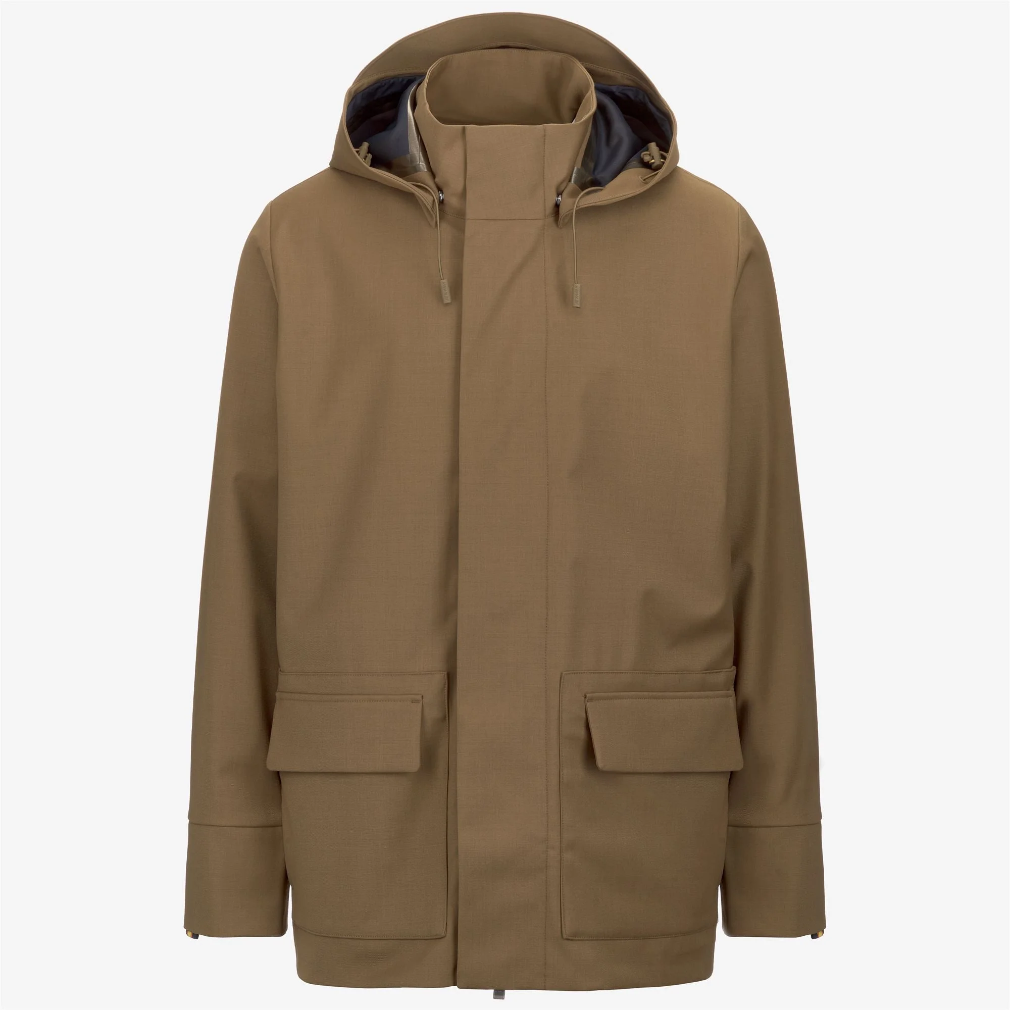 Brown Blue Men's Water-Repellent City Jacket with Detachable Hood Erhal is a men’s medium length jacket which is ideal for autumn, reinterpreting the classic field jacket with a city-lifestyle twist. The sleek silhouette of this jacket features an outer shell made from water-repellent technical wool, an internal membrane, and a soft jersey lining with heat-taped seams. It stands out for its clean line, with concealed zip closure, tone-on-tone button and no logos on the front. The style includes a detachable and adjustable hood, large pockets with flaps and concealed buttons, and the detail of the K-Way tape on the cuff. - Three-layer water-repellent and windproof wool blend fabric - Zip closure - Concealed button pockets - Detachable and adjustable hood - Heat-taped seams - Regular fit - K-Way tape detail on the cuff Features Description: Jackets, Mid Gender: Man Season: Fall, Winter Composition Entire: 70% Polyester, 30% Wool Style: K51369W - Color: AR1