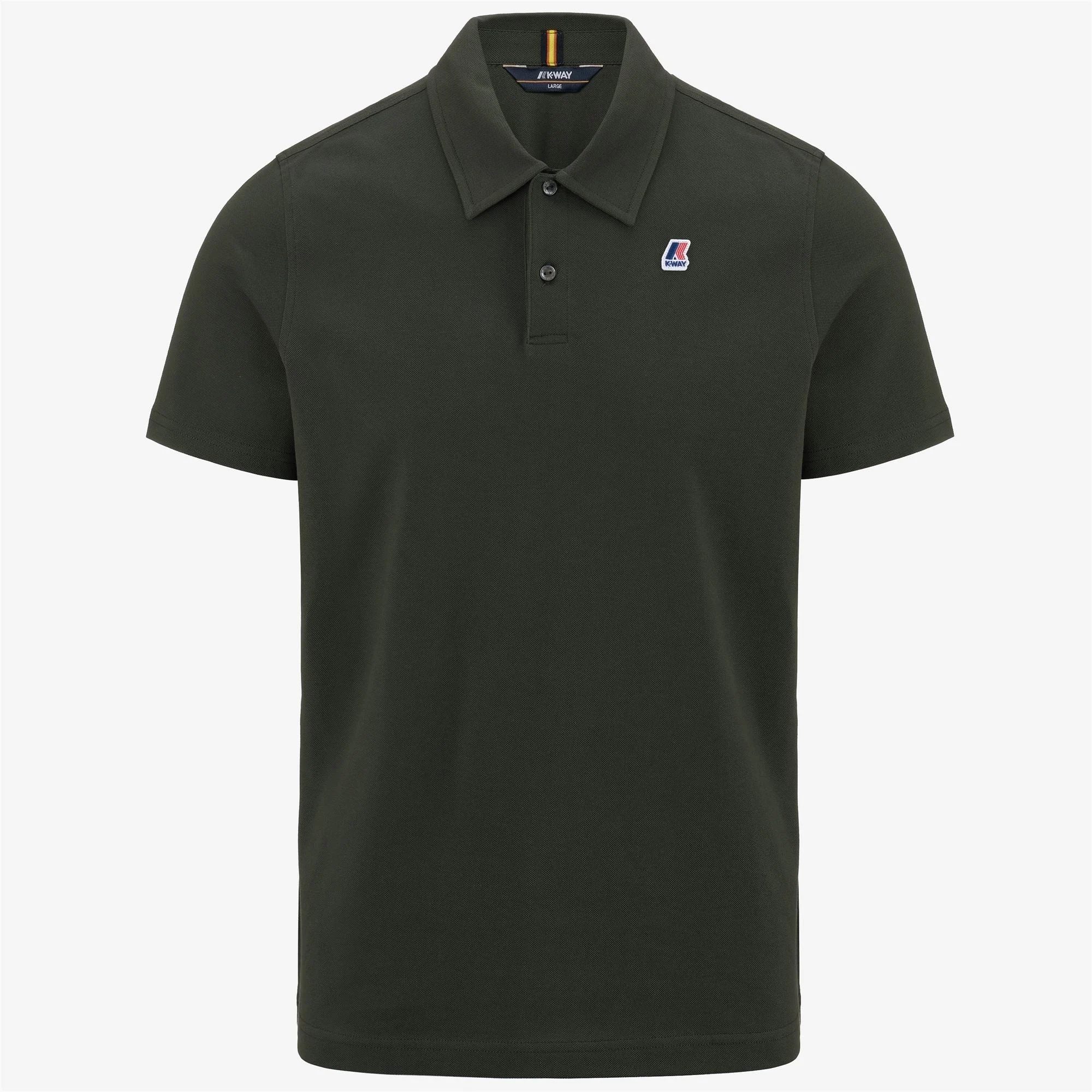 Blackish Green Men's Polo Shirt for City Wear Men’s short-sleeve, tight-fitting polo shirt in 95% cotton, 5% elastan pique stretch fabric. The neck features a sweat-proof strip. Mother of pearl buttons sewn onto K-Way micro-tape. The shirt also features two small side splits for a more comfortable fit. K-Way logo embroidered on the front. QR label and printed labels inside. Features Description: Polo Shirts, Polo Gender: Man Season: Spring, Summer Composition Entire: 95% Cotton, 5% Elastane Style: K007270 - Color: WMR