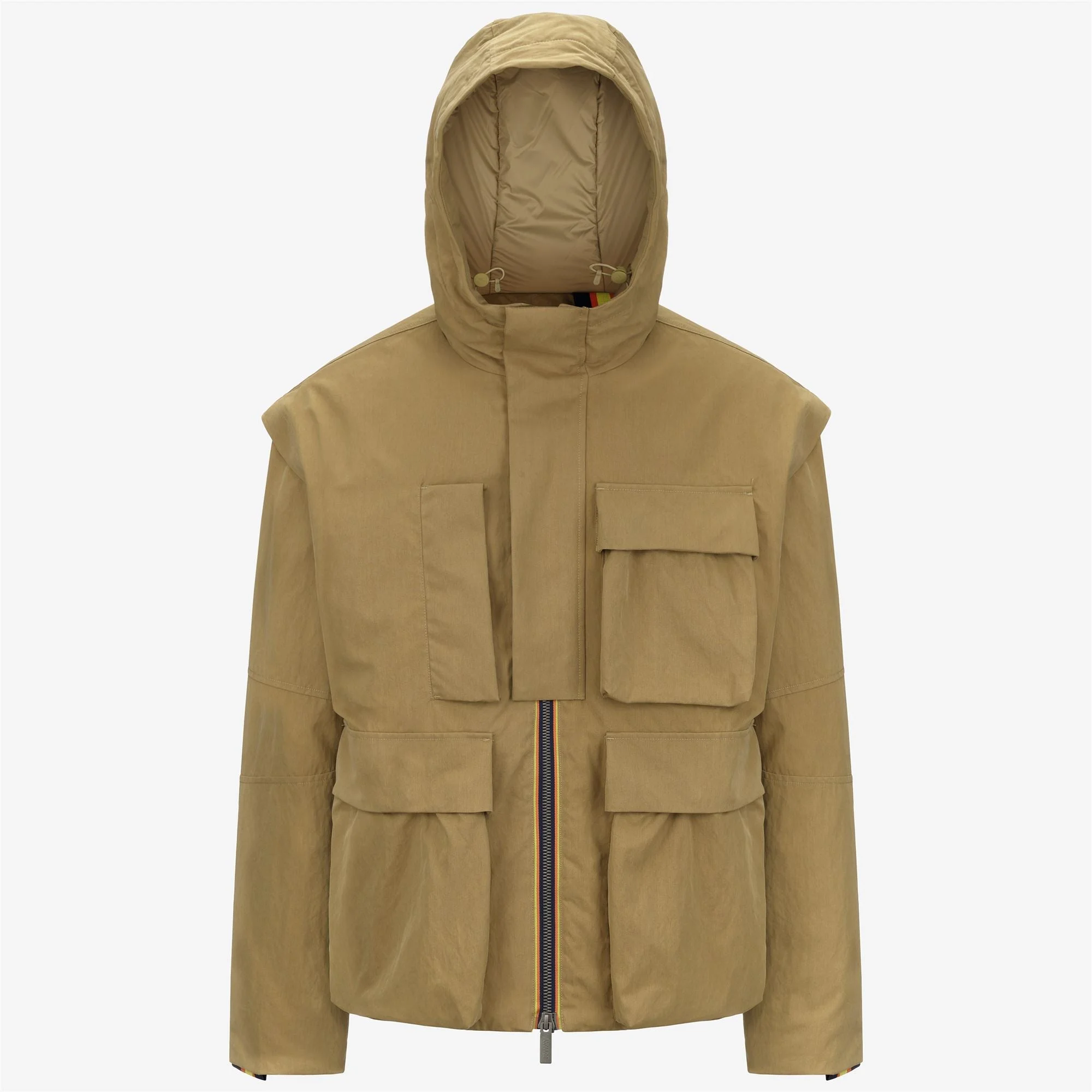 Beige Men's Short Cotton Parka with PrimaLoft Padding Guillermo is a men’s short parka designed to complement an urban look, ideal for transitional seasons and early cold spells. Made from brushed cotton-blend fabric, it features lightweight PrimaLoft® padding for extra comfort and protection. Functional details include an enveloping hood, adjustable hem and roomy patch pockets. - Brushed cotton-blend fabric - Lightweight eco-friendly PrimaLoft® padding - Medium warmth rating - Adjustable drawcord hood - Double-slider zip fastening - Partial zip flap - Internal cuffs - Vertical chest pocket - 3 patch flap pockets - Adjustable drawcord hem - Regular fit - K-Way tape detail at the cuff Features Description: Jackets, Short Gender: Man Season: Fall, Winter Composition External: 64% Cotton, 36% Recycled Nylon Padding: 100% Polyester Lining: 100% Polyester Style: K7136DW - Color: B2O