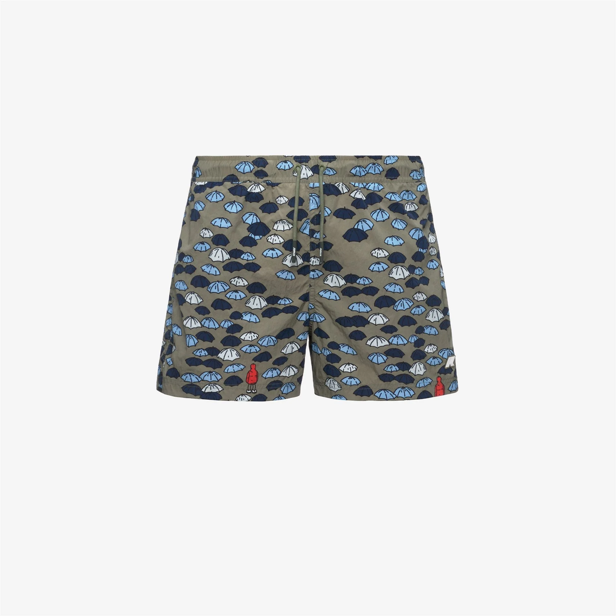 Hazel men's swimming trunks boast a versatile, functional design. Made from quick-dry fabric with an all-over print, they feature external pockets, an internal coin pocket, an elasticated waistband, inner mesh brief, and side slits for unrestricted movement. - Quick-dry, UV-protective technical fabric - Inner mesh brief - Elasticated waistband with adjustable drawstring - Side pockets - Back pocket with strap fastening - Internal coin pocket - Regular fit - all - over print - White silicone logo patch Features Description: Bathing Suits, Swimming Trunks Gender: Man Season: Spring, Summer Composition External: 100% Nylon Lining: 100% Polyester Style: K4133TW - Color: V15