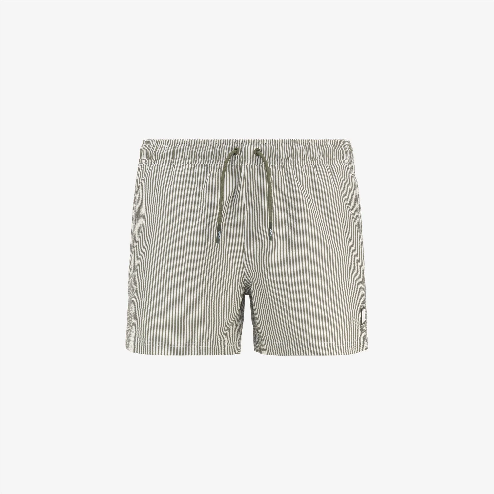 Striped Green Grey Men's Quick-Dry Swimming Trunks The Hazel men's mid-length swimming trunks boast an essential yet versatile look. These trunks feature two pockets on the sides and one on the back, with K-Way tape detailing. Made from quick-dry, striped seersucker fabric, the garment also features an elasticated waistband, inner mesh briefs and side vents that allow for unrestricted movement. - Quick-dry seersucker fabric - Mesh briefs - Elasticated waistband - Side pockets - Back pocket with strap closure - Inner coin pocket - Regular fit - Silicone logo patch Features Description: Bathing Suits, Swimming Trunks Gender: Man Season: Spring, Summer Composition Entire: 100% Polyester Style: K8141KW - Color: AZX