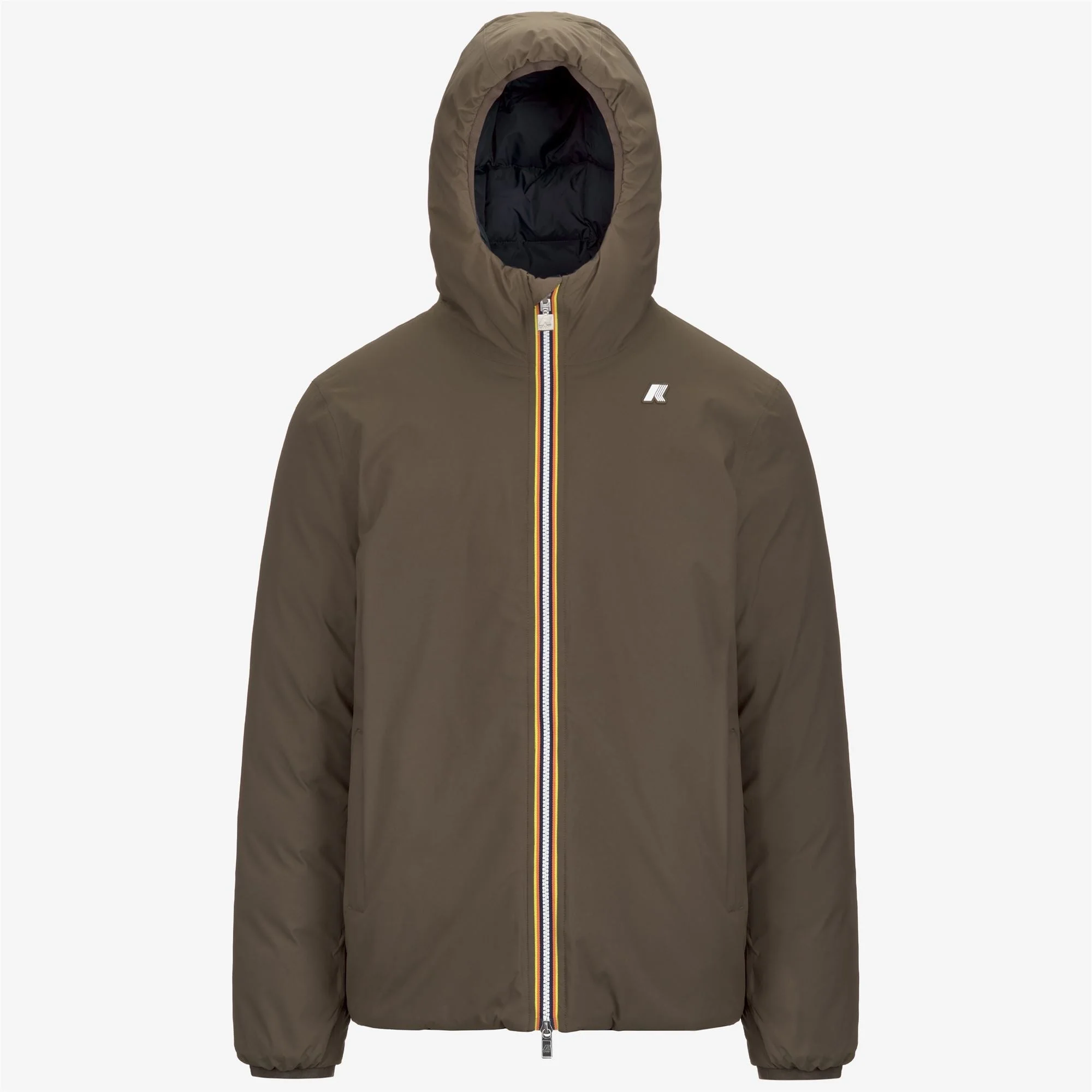 Brown Men's Reversible Short Jacket with Down Insulation Designed for extreme winter temperatures whilst being kind to the planet, the Jack men's short jacket is insulated with Down padding: a highly insulating recycled fibre. Its reversible design combines a smooth technical fabric side with a contrast quilted nylon reverse. Complete with a hood, pockets, zip fastening and storm flap, adding an ultra-functional touch for maximum protection from the cold. - Waterproof, water-repellent and windproof recycled nylon ottoman - Windproof and breathable quilted nylon with down filling - Down padding - Ultra-warm - Reversible - Heat-taped seams - Adjustable hood with elastic cords and stoppers - Zip fastening - Elasticated cuffs - 2 zip pockets - 2 snap button pockets - Slim fit - White silicone logo patch Features Description: Jackets, Short Gender: Man Season: Fall, Winter Composition External: 24% Poliuretane, 76% Recycled Polyester Lining: 100% Recycled Nylon Padding: 90% Duck Down, 10% Duck Feather Style: K8127WW - Color: ATV