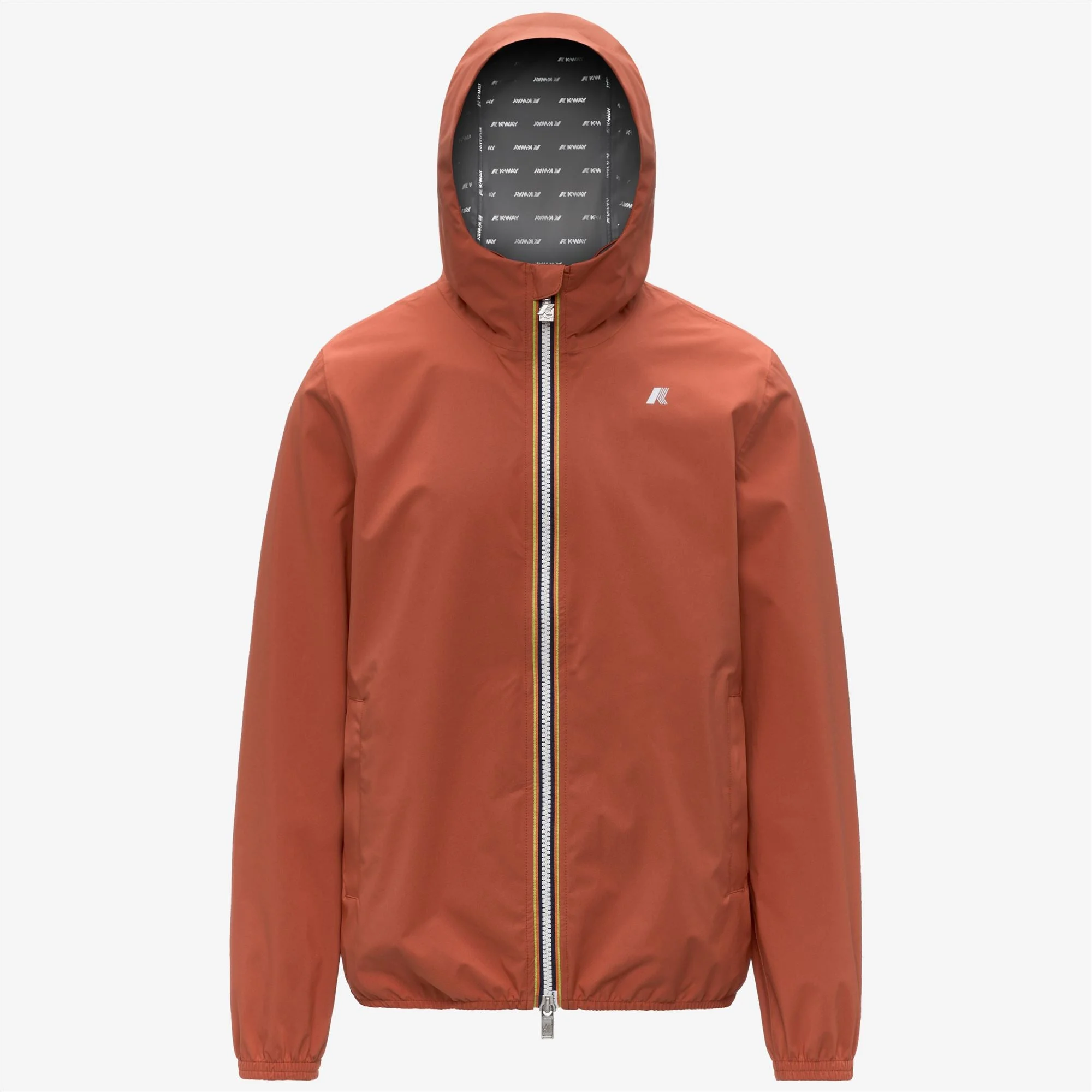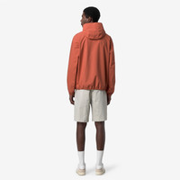 Jack is a men's short slim fit jacket, perfect for transitional seasons. It's crafted from stretch technical fabric that allows for unrestricted movement while providing rain and wind protection, with water resistance up to 10000 mm. The interior is lined with an insulating membrane with all-over silver-tone K-Way lettering print. Functional details, such as zipped pockets, a wrap-around adjustable hood, and elasticated cuffs and hem ensure an easy, comfortable fit. - Waterproof, windproof and breathable stretch polyester fabric - DWR (Durable Water Repellent) treatment - Water resistance: 10000 mm water column - Logo-printed interior membrane - Heat-taped seams - Adjustable drawstring hood with stoppers - Zip fastening - Elasticated cuffs and hem - 2 zipped pockets - Slim fit - White printed logo Features Description: Jackets, Short Gender: Man Season: Spring, Summer, Fall, Winter Composition Main Fabric: 24% Poliuretane, 76% Recycled Polyester Style: K5127QW - Color: 896