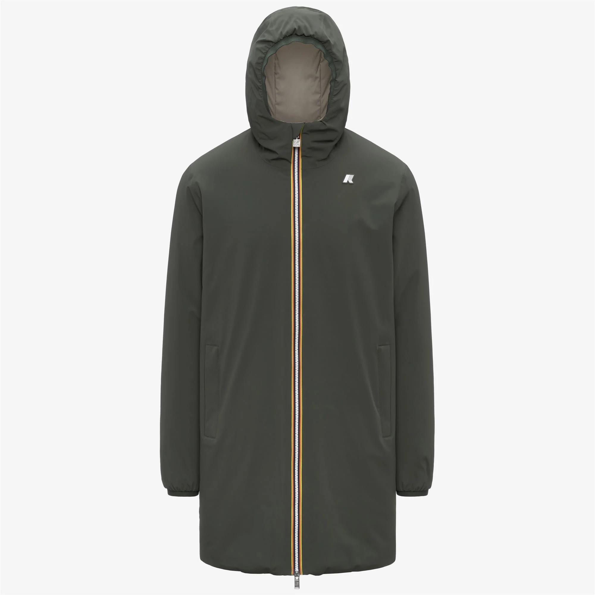 The Jacob men’s three-quarter jacket is K-Way’s creation for in between seasons and winter’s first chilly days. The design fuses style with functionality and pairs seamlessly with a range of outfits, thanks to its versatile reversible construction. The outer layer is crafted from waterproof stretch polyester, whilst the reverse is made from contrast windproof polyester. Synthetic padding ensures optimal comfort and the perfect mid level of warmth, whilst heat-taped seams keep the cold air out. - Waterproof, water-repellent, windproof and breathable stretch polyester - Windproof and water-repellent polyester - Synthetic padding - Medium warmth - Reversible - Heat-taped seams - Adjustable hood with elastic cords - Zip fastening - Elasticated cuffs - 2 zip pockets - 2 snap button pockets - Regular fit - White silicone logo Features Description: Jackets, 3/4 LENGTH Gender: Man Season: Fall, Winter Composition Padding: 100% Polyester External: 8% Elastane, 92% Nylon Lining: 100% Polyester Style: K6128WW - Color: B2P