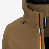 Brown Men's Ski Jacket with Waterproof Corduroy Fabric Malamot is a high-performance men's jacket designed for leisure time in the mountains or to tackle easy hiking routes. It features a contemporary, technical construction, accessorized with several functional pockets, a ski pass pocket on the sleeve, and inner cuff gaiters providing a snug fit. The two-layer padded, waterproof and windproof corduroy fabric is designed to withstand the pressure of a 10-meter high water column to keep you dry even at peak humidity. This advanced technology ensures that the jacket offers optimal protection during outdoor sports activities while maintaining excellent breathability. PrimaLoft Eco recycled synthetic padding and quilted nylon lining provide a high warmth grade and excellent thermal insulation due to their ability to decrease body heat loss and resist the cold outside, ensuring quick drying even in extremely cold conditions. - Waterproof, 10000 mm water-repellent, windproof and 10000 g/m2 breathable double-layer corduroy fabric - Synthetic padding made from PrimaLoft Eco, a highly insulating fiber obtained from recycled polyester - Quilted nylon lining - Ultra-warm - Heat-taped seams - Adjustable and detachable peaked hood with drawstring and stoppers - Adjustable neck with drawstring and stoppers - Supportive heat-taped padding on the shoulders - Underarm zip openings for ventilation - Waterproof zip and flap closure - Windproof flap - Elasticated inner cuffs and external adjusters - Welt pockets - Skipass pocket on the sleeve - Detachable inner waist gaiter - Inner mesh pockets - Inner zipped pocket with transparent section - Regular fit - Black silicone logo patch Features Description: Jackets, Mid Gender: Man Season: Fall, Winter Composition External: 2% Elastane, 98% Polyester Lining: 100% Nylon Padding: 100% Recycled Polyester Style: K6117ZW - Color: 045