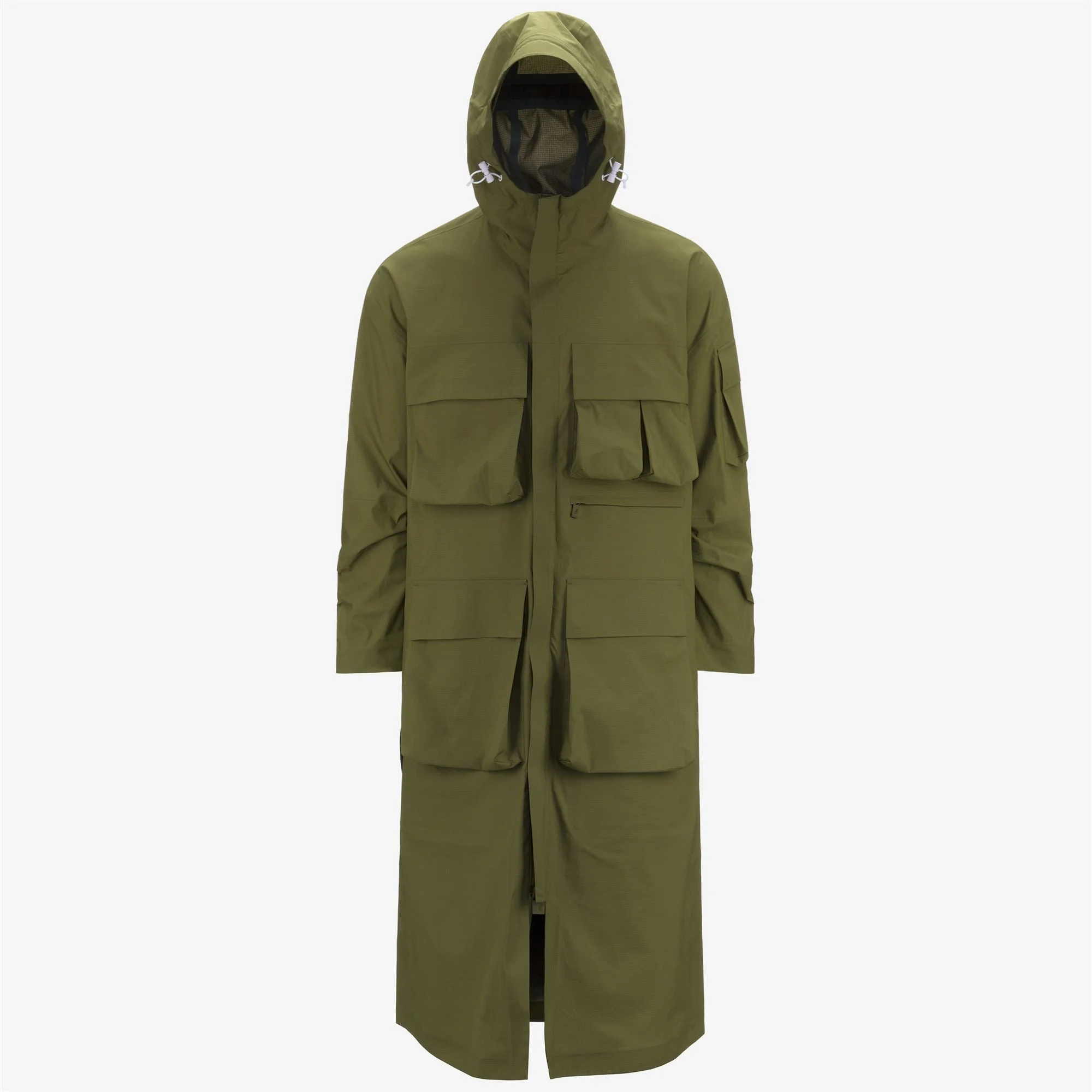 Sphagnum Green Unisex Long Waterproof City Jacket Parkeur is an extra-long jacket with a sporty and loose fit design, perfect for mid seasons. It is crafted from a 3-layer technical fabric that is windproof and waterproof up to 5000 water columns, providing comfort against the skin. The jacket is characterized by its utility style: a full zip construction with an enveloping hood, elasticized cuffs, 4 large front flap pockets, a sleeve pocket, and a rear pocket that allows the garment to be packed away. Amiable is the K-Way project that combines functionality and environmental respect. This garment is made from 100% recycled and recyclable nylon and is finished with windproof thermosealed seams, also made from recycled materials. Features Description: Jackets, Long Gender: Unisex Season: Spring, Summer Composition Entire: 49% Nylon, 21% Polyester, 30% Poliuretane Style: K1122LW - Color: XZ0