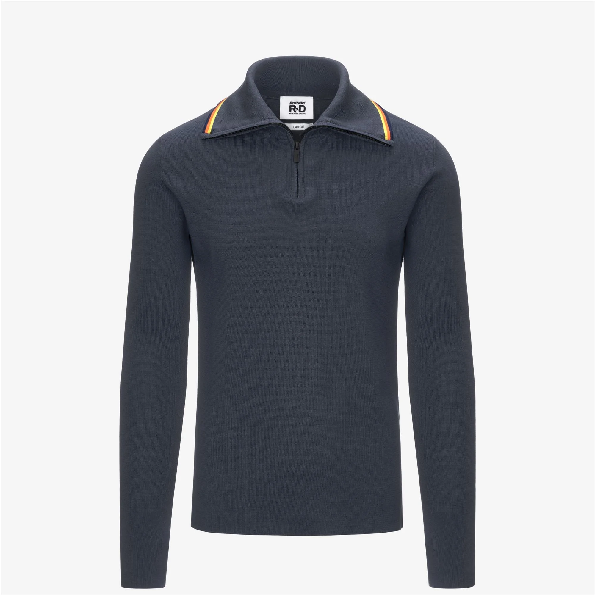 Blue Men's Cotton Knit Jumper with Zipped Collar Polom is a men’s long-sleeve pullover designed for transitional weather. Crafted from soft, zero-pilling Egyptian cotton yarn, this piece features a zipped collar that can be styled in two ways: folded down like a polo shirt or worn as a high collar for a warm, snug feel. When folded down, the collar reveals a trim in K-Way®’s signature colours. - Zero pilling Egyptian cotton yarn - High collar - Shaped cuffs with thumbholes - Half-zip closure with concealing trims - Regular fit Features Description: KNITWEAR, Jumper Gender: Man Season: Fall, Winter Composition Main Fabric: 100% Cotton Style: K4132EW - Color: XCT