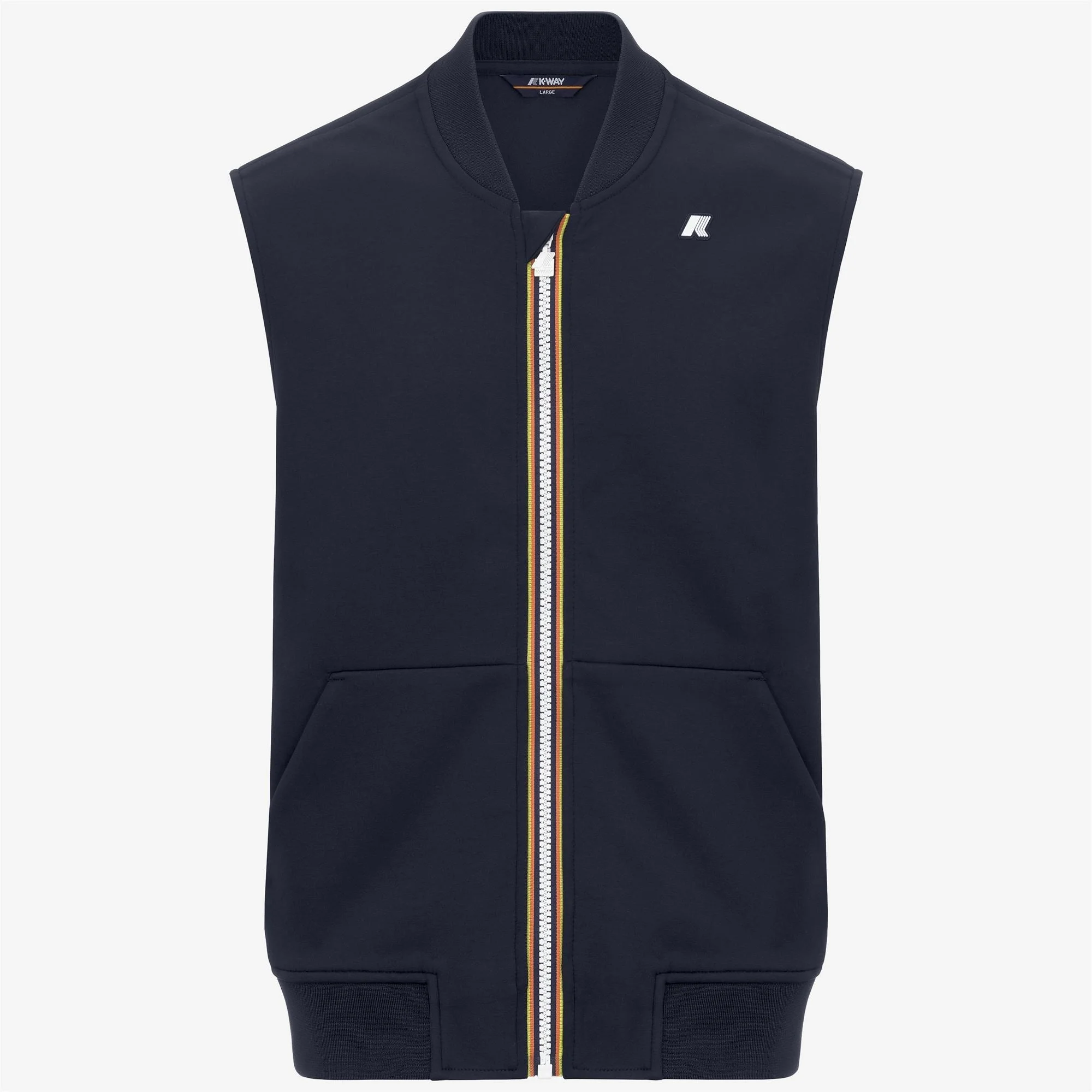 Blue Men's Lightweight Fleece Vest with Ribbed Collar Sandor is a men's vest made from lightweight scuba, a material with a soft and flexible texture that provides comfort and freedom of movement. This versatile regular fit garment is finished with a bomber-style ribbed collar and ribbed hem for comfort and functionality on any occasion. - Matte thick interlock fabric - Ribbed bomber-style collar - Zip fastening - Ribbed cuffs and hem - Inset pockets - Regular fit - White silicone logo patch Features Description: Fleece, Vest Gender: Man Season: Spring, Summer, Fall, Winter Composition Entire: 4% Elastane, 81% Polyester, 15% Rayon Style: K1151TW - Color: K89