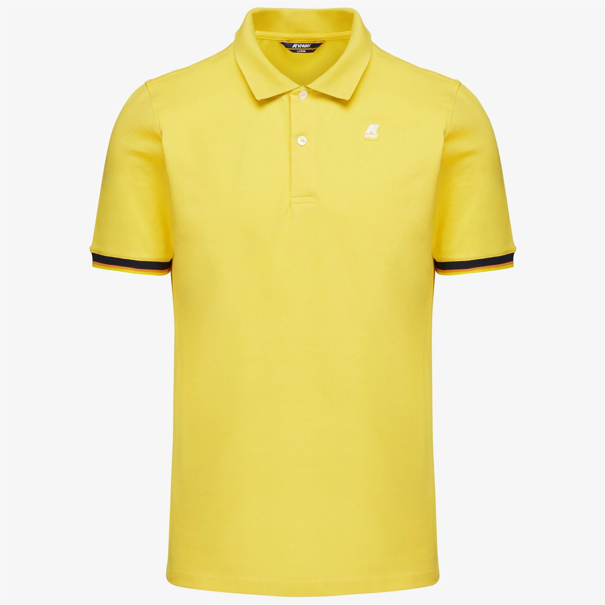 Sunstruck Yellow Men's Stretch Cotton Polo Shirt with Striped Trims The Vincent men’s stretch cotton pique polo shirt combines elegance and functionality to suit any look. The design features short sleeves with striped trims in classic K-Way colours. Finished with side slits for freedom of movement. - Stretch pique fabric - Ribbed collar - Striped collar underside - Two-button fastening - Branded buttons - Striped sleeve trims - Side slits - Slim fit - White silicon logo patch Features Description: Polo Shirts, Polo Gender: Man Season: Spring, Summer, Fall, Winter Composition Entire: 95% Cotton, 5% Elastane Style: K7121IW - Color: XZ7