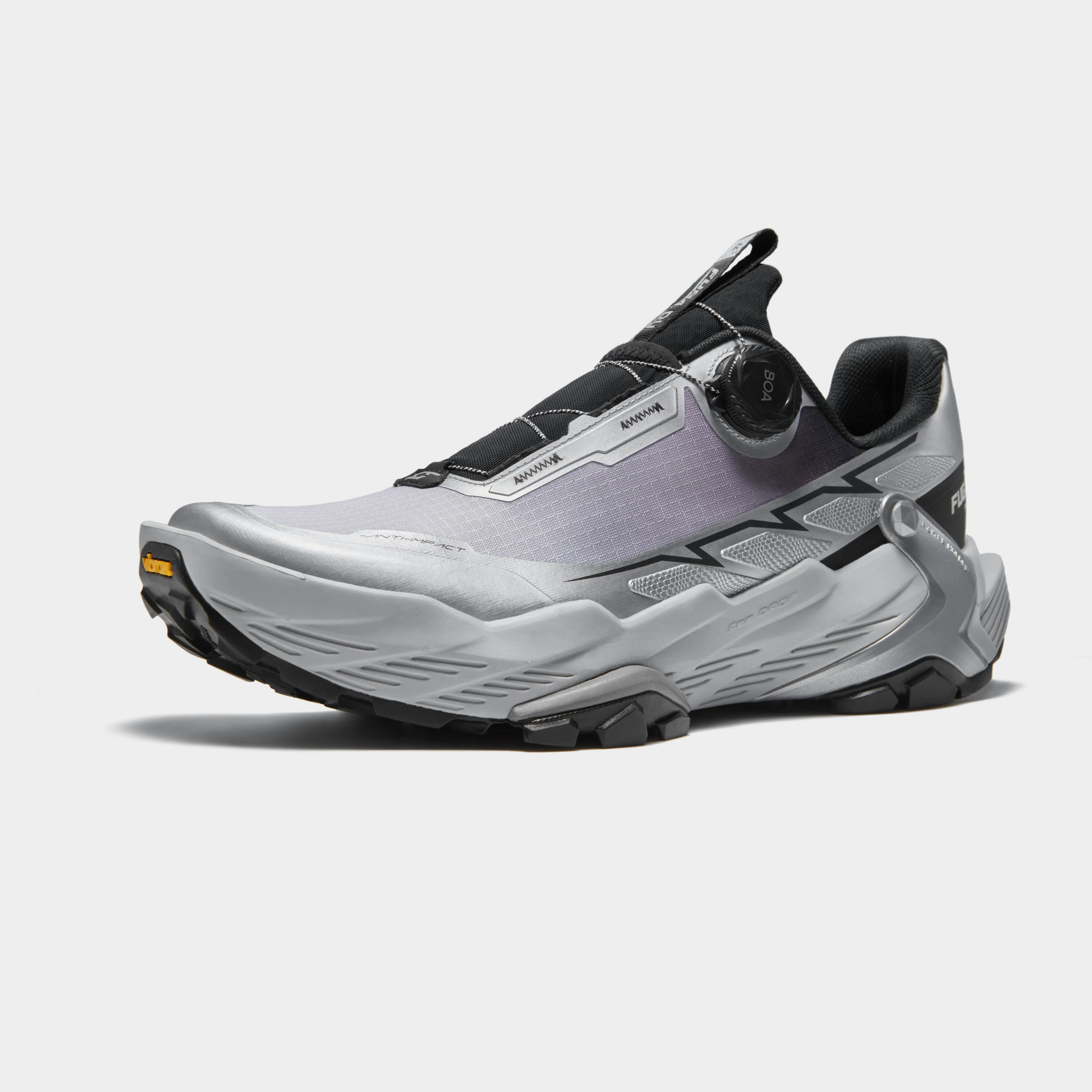 ●The BOA® Fit System delivers micro-adjustable, precision fit engineered to perform in the toughest conditions ●The BOA® Fit System is guaranteed for the one-year time of the product on which it is integrated 1. Tyre-like Lugs for Powerful Grip ●Multi-directional triangle lugs on forefoot provide powerful grip on uphill trails ●125mm ultra wide forefoot adds more grip area ●Vibram Megagrip outsole offers unparalleled grip on wet and slippery surfaces 2. New Power System for Better Cushioning and Rebound ●Dual-density midsole: -Upper part: cushioned-Lower part: supercritical foam ensure that 62% energy can be returned 3. Heel Support System ●TPU heel support frame stabilizes ankle and helps with lateral ankle movement 4. KAILAS 4-point Gaiter Holder System ●KAILAS 4-point gaiter holders can fix an anti-debris gaiter on the shoes firmly, preventing debris from entering the shoe ●Drop:8mm ●Upper: Engineered mesh / TPU film ●Bottom: Vibram Megagrip outsole ●Lining: Sandproof and breathable lining ●Recommended Use: Trail running, mixed terrain,City