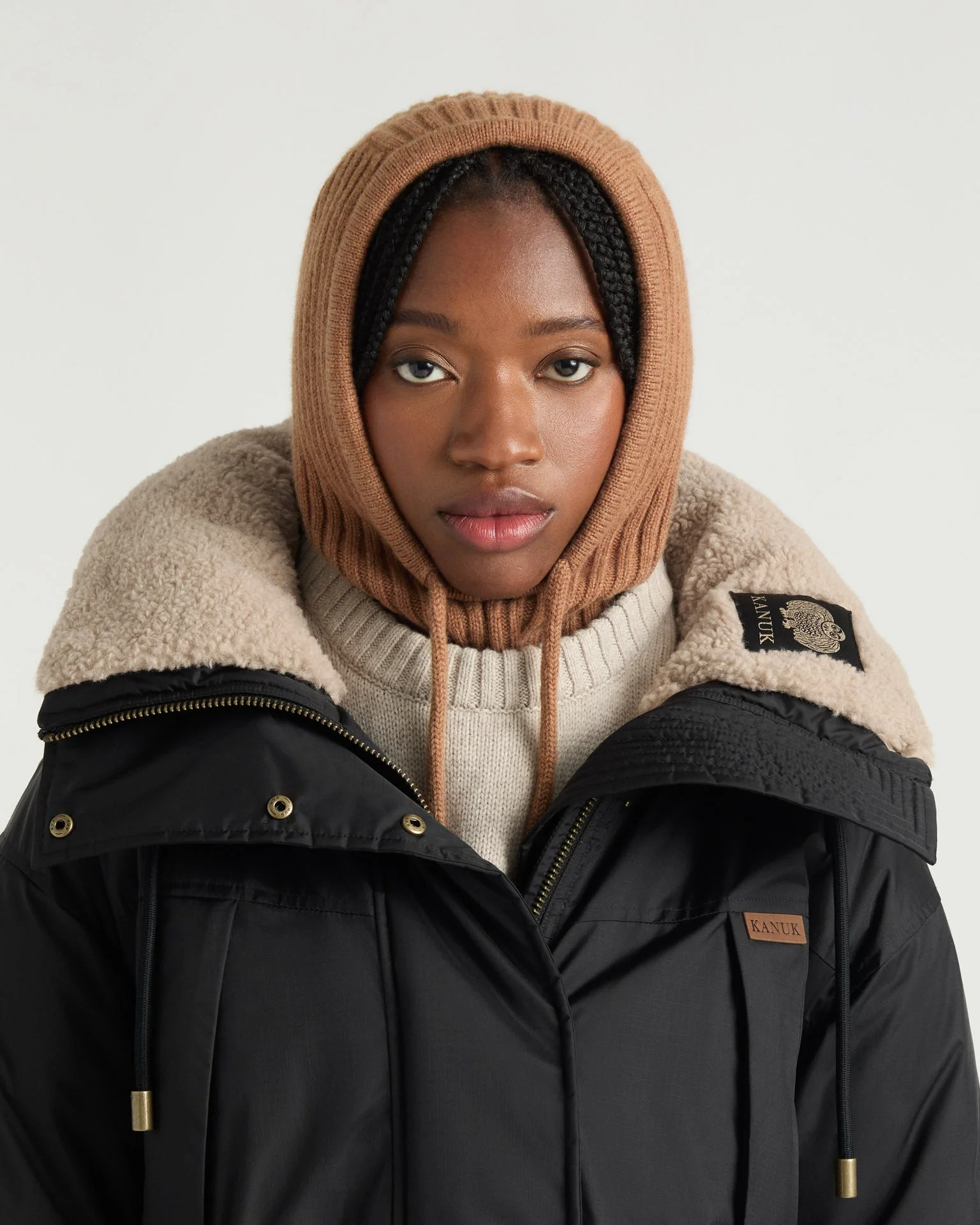 Cap-Chat is a ribbed knit balaclava with a nubuck logo patch in the bottom corner. Fabric details & care - Shell: 90% wool, 10% cashmere - Dry clean only