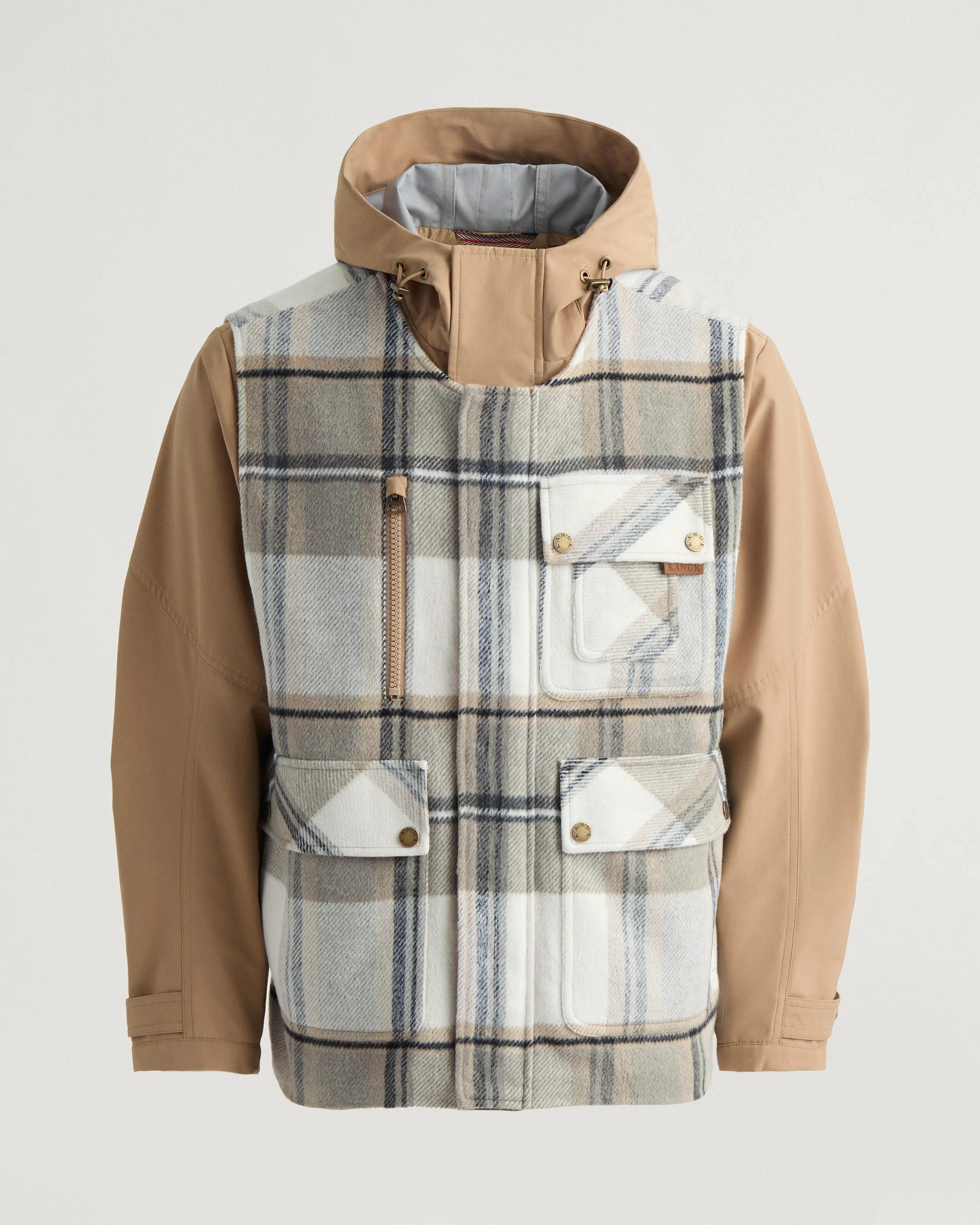 Fusion is a modular raincoat with a seam-sealed shell and removable plaid vest. - Fixed hood with adjustable bungee cord - Kanuk's iconic logo patch on inside left hood - Removable multi-pocket plaid vest - Center front zipper with velcro placket - Adjustable cuffs with sleeve tabs - Seam-sealed construction Fabric details & care - Water resistant, breathable, windproof - Shell: Natural Tech in 100% recycled nylon - Lining: 100% polyester - Vest: Brushed Plaid in 82% polyester, 12% acrylic & 6% other fibers - Insulation: PrimaLoft® Silver Insulation Active - Dry clean only Sizing & fit - Center back length for size M: 28" / 72 cm - Relaxed fit - Model is 6'1" and is wearing a size M - Fits true to size