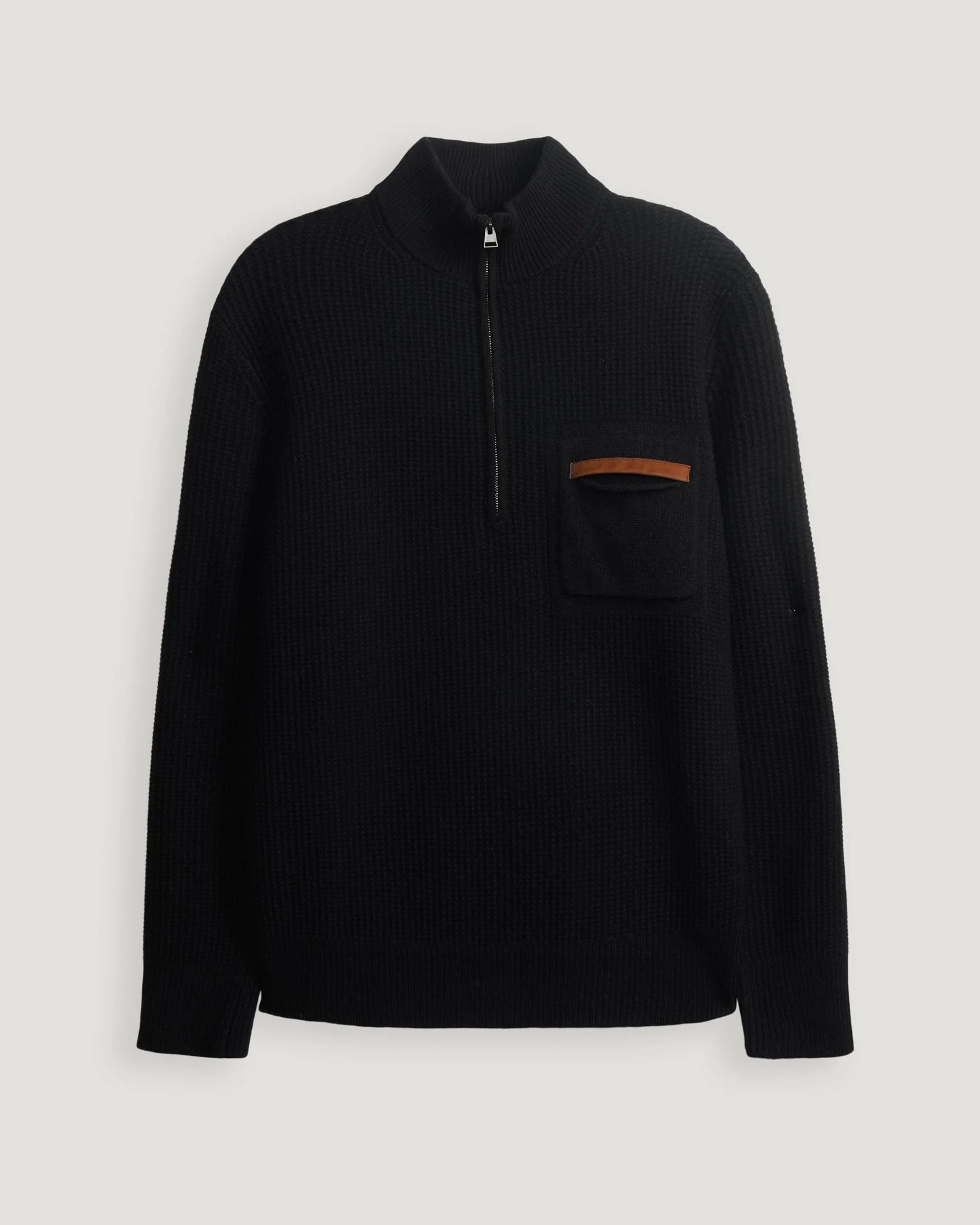 Griffon is a half-zip sweater crafted from a wool-cashmere blend and finished with nubuck trims and elbow patches. - Nubuck trim and elbow patches - Center front half-zip closure Fabric details & care - Nubuck trim and elbow patches - Center front half-zip closure - Dry clean by leather specialist Sizing & fit - Center back length for size medium: 27" / 69 cm - Relaxed fit - Model is 6'2" and wears a size M - Fits true to size