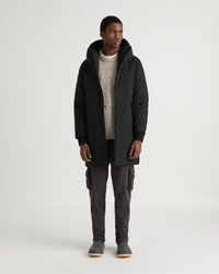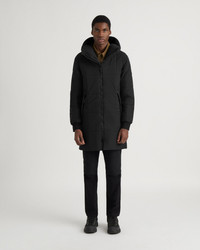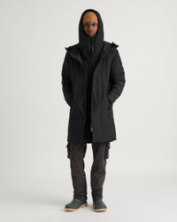 Halloway is a mid-calf 3-in-1 coat with an insulated inner layer, hand-warming pockets, and an adjustable elastic hood. - Comfort zone: 0 °C to -10 °C - Insulated with Thindown - Removable quilted inner jacket with hood - Center front zipper closure - Zippered hand pockets - Adjustable hood with bungee cord Fabric details & care - Water-resistant, breathable, windproof - Shell: Natural Tech in 50% cotton, 50% polyester - Contrast: Soft Touch in 100% recycled polyester - Lining: Soft Touch in 100% recycled polyester - Insulation: Thindown - Dry clean only Sizing & fit - Relaxed fit - Model is 6'3" and wears a size M - Fits true to size