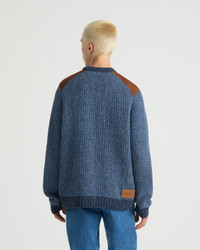 Saint-Bruno is a crew neck sweater knit from a soft merino wool-alpaca blend with nubuck shoulder patches. - Nubuck shoulder patches - Kanuk nubuck label at the lower right back hem Fabric details & care - Shell: 65% extrafine RWS merino wool, 30% recycled nylon, 5% alpaca - Trim: Genuine nubuck - Dry clean by leather specialist Sizing & fit - Center back length for size medium: 25.5" / 65 cm - Relaxed fit - Model is 6'1" and wears a size M - Fits true to size