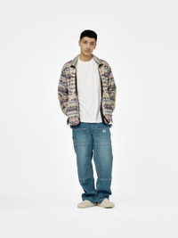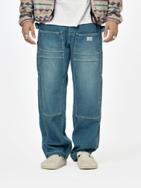 The 11.5oz Denim LUMBER Pants by Kapital. Made from 100% cotton denim, these sturdy pants feature a custom-washed early fade and a variety of pockets including two back, two front, two front of thigh, and two outer thigh pockets. With a buckle back, suspender buttons, and belt loops, these pants will never fall down. The double knee is reinforced with quilted diamond stitching, and the fit is comfortable with a high rise, roomy thighs, and slight taper. Perfect for wearing with engineer boots or classic converses. 100% Cotton Model is 5'11 wearing a size 3 Made in Japan