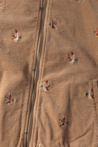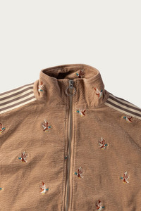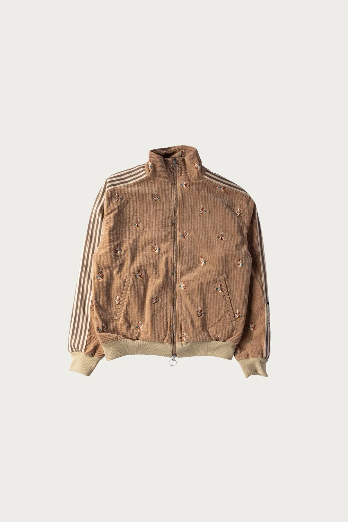Kapital reimagines the classic track jacket through their unmistakable lens, blending sport nostalgia with playful craftsmanship. Cut from a soft eleven wale stretch corduroy, the jacket has a warm hand and an easy drape that feels instantly broken in. The surface is covered with Kapital’s duck embroidery, each one slightly imperfect in the best way, giving the piece personality without going over the top. Signature banner stripes run across the sleeves, grounding the corduroy texture with a familiar athletic feel. A tall funnel neck, two way ring zip, and ribbed cuffs and hem finish the silhouette, making it equal parts cozy and collectible. It is one of those Kapital pieces that feels whimsical and wearable at the same time, and layers well over tees or hoodies when the weather cools. - Eleven wale stretch corduroy - All over duck embroidery - Banner stripe sleeves - Funnel neck - Two way ring zip closure - Ribbed cuffs and hem - Front welt pockets - Cotton and polyurethane blend - Made in Japan