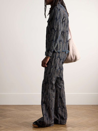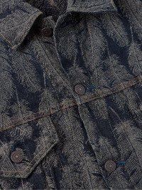 KAPITAL's 'Magpie' jacket is jacquard-woven with the wispy feathers of the bird its named after. It's cut for a roomy fit from 12oz. denim and has an uneven frayed hem. Team it with the matching jeans. Small to size. See Size & Fit notes. Size & Fit - Size 1 = XS, 2 = S, 3 = M, 4 = L, 5 = XL and 6 = XXL - Fits small to size. Take one size larger than normal - Designed for a slightly loose fit - Mid-weight, non-stretchy fabric - Model is shown wearing a 4 - Model measures: chest 38"/ 96cm, height 6'2"/ 188cm Details & Care - Dark-blue and beige denim-jacquard - Button fastenings - 100% cotton - Machine wash