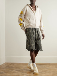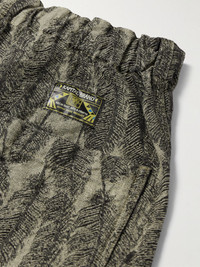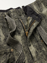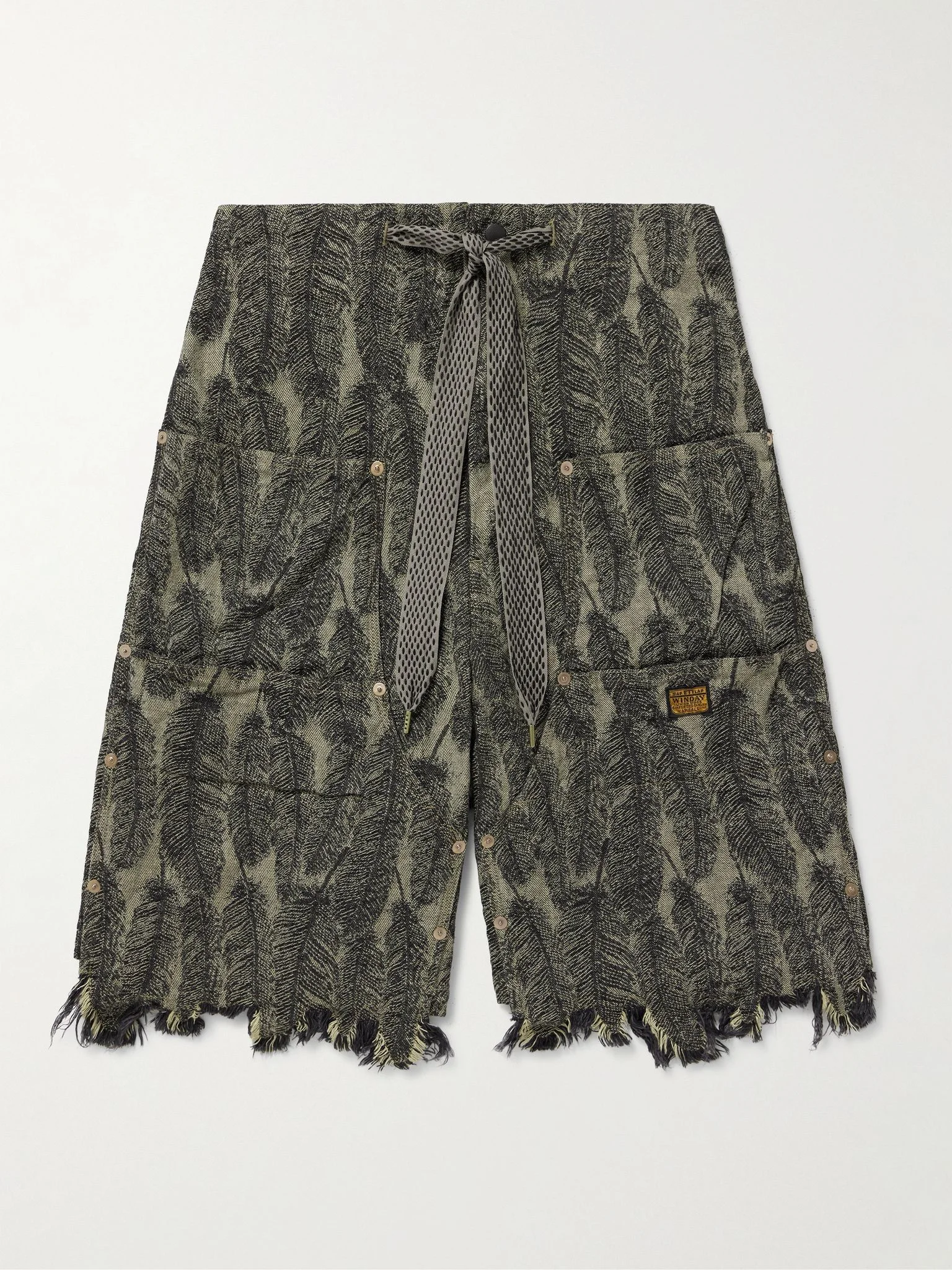 KAPITAL has a knack for designing playful, artistic garments that won't go unnoticed. These shorts are made from cotton that's jacquard-woven with 'Magpie' feathers, which are reflected in the frayed, asymmetric edges. They're cut straight and have extra pockets and rivets on the legs. Size & Fit - Size 1 = W28, 2 = W30, 3 = W32, 4 = W34, 5 = W36 and 6 = W38 - Fits true to size. Take your normal size - Wide leg, low-crotch style - Drawstring at the waist - Mid-weight, non-stretchy fabric - Model is shown wearing a 3 - Model measures: waist size 32, height 6'2"/ 188cm Details & Care - Green and black cotton-jacquard - Snap and zip fastening - 100% cotton - Machine wash or dry clean