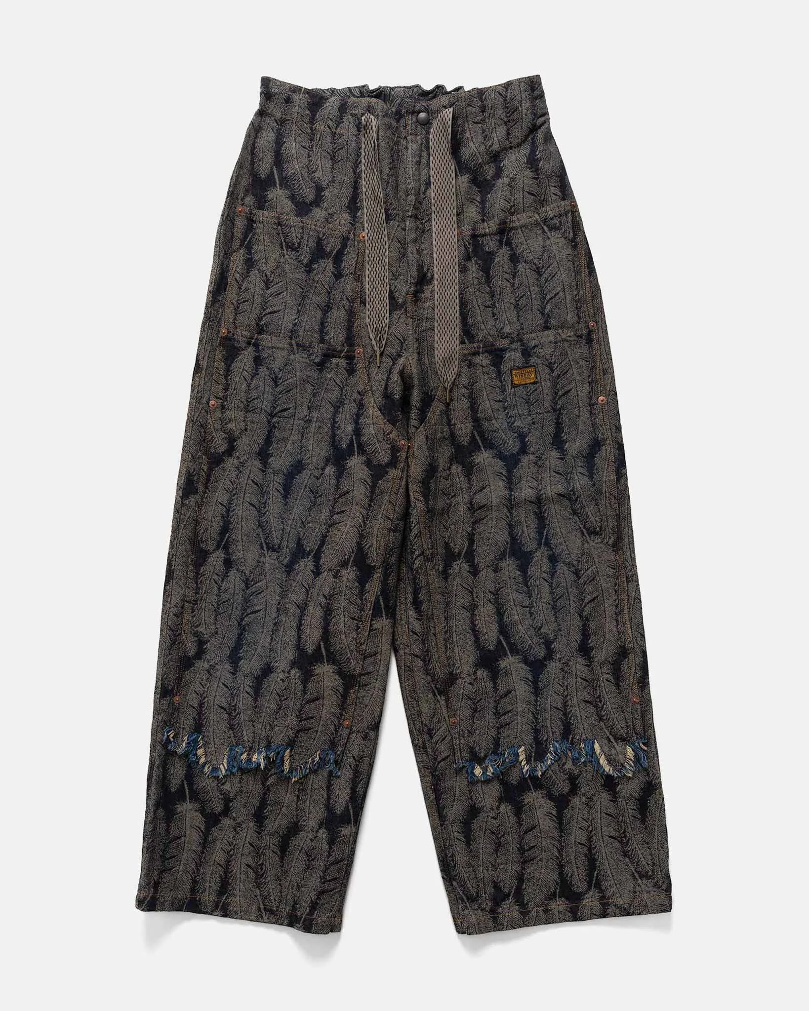 Loose through the leg with a cropped, wide silhouette, the KAPITAL 12oz MAGPIE Denim W-Knee EASY Baggy Pants are built for comfort and visual impact. Constructed from lightweight 12oz cotton denim, the all-over magpie feather motif is offset by exposed seam detailing and raw-edge panels at the knees. Easy to pair with matching tops or oversized outerwear. DETAILS - K2403LP014 - 100% cotton - 12oz denim with all-over feather jacquard - Wide baggy fit with straight cropped leg - Elastic waistband with external drawcord - Snap button front closure - Zipper fly - Reinforced W-knee panel with raw edge detail - Riveted front patch pockets - Rear patch pockets - Woven label above back pocket - Made in Japan