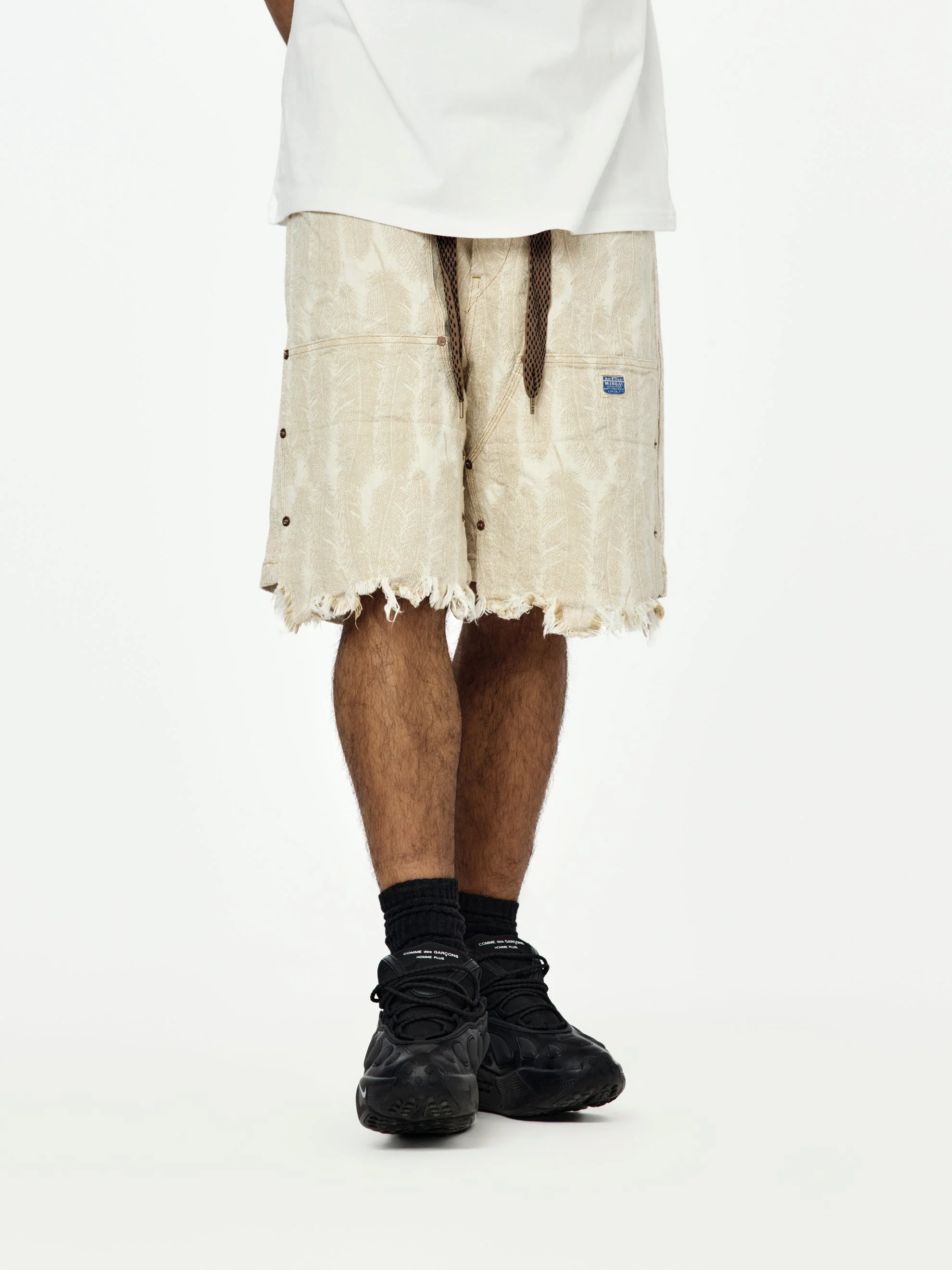 Cut from patterned 12oz denim, these easy shorts balance function and flair with reinforced double knees and raw hems. The relaxed silhouette and deconstructed wash give them a worn-in feel that pairs effortlessly with oversized shirts or light outerwear. Made in Japan. SKU: EK-1721SP