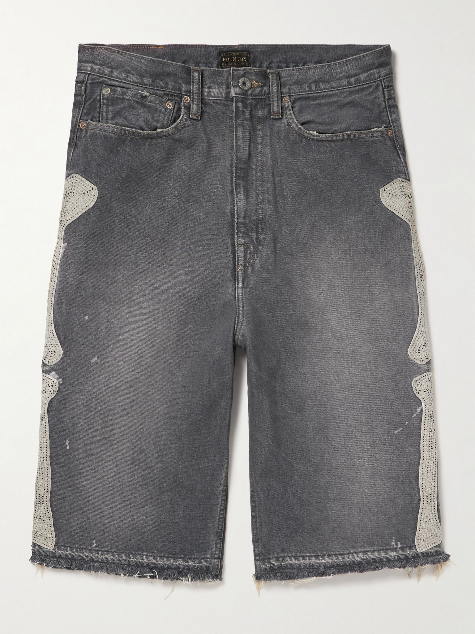 Wide-Leg Appliquéd Distressed Denim Shorts Gray
