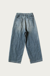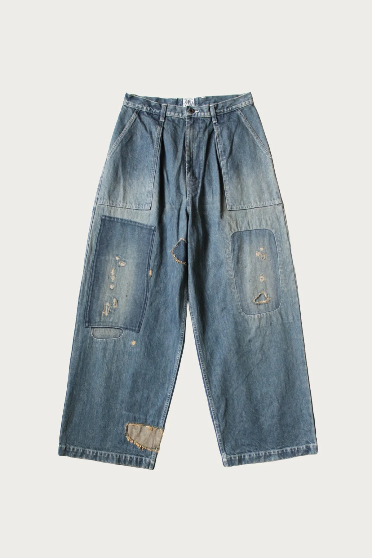 Kapital reimagines classic military wear through a distinctly DIY lens with the RUSHFIELD Remake Fatigue Baggy Pants. Built from sturdy 14oz denim, this pair takes the shape and utility of traditional fatigue trousers and infuses them with raw, lived-in energy. Hand-finished distressing, patchwork, and reinforced paneling transform each pair into a one-of-a-kind artifact—part vintage, part experimental, all Kapital. The exaggerated baggy fit provides a relaxed silhouette that pairs perfectly with cropped jackets and oversized tees. Signature details like the slanted patch pockets and drawstring waist root the piece in its utilitarian past, while the RUSHFIELD finish offers a future-forward sense of individuality. - 100% cotton 14oz denim - Fatigue-style front patch pockets - Unique RUSHFIELD Remake distressing and mending - Baggy, full-leg fit with drawcord waist - Reinforced panel construction - Made in Japan