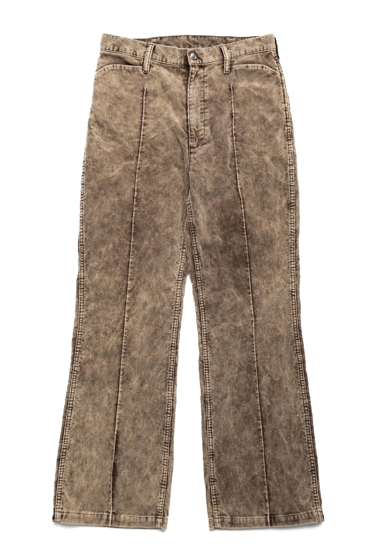 - The silhouette of Frisco Jeans, which has room around the thighs, is arranged in a slightly flared style. - 14-wale corduroy fabric with a distinctive, uneven dye finish. - Color: Brown - L-shaped pocket - It has a pintuck design that looks like a center press. - Zipper Fly - 85% Cotton, 15% Polyester - Tears and damage resulting from this process are intentional design elements and not product defects. - Made In Japan - Model is 6'2 wearing a size 32