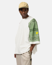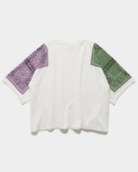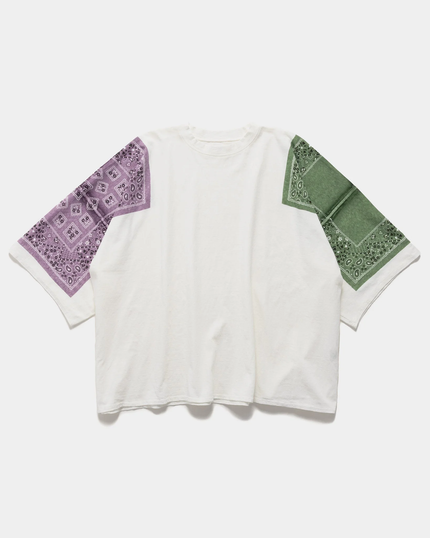 The KAPITAL 18.5/-Jersey Bandanna HUGE-T (PECKISH RAINBOWY) delivers oversized ease with a playful twist. Crafted from soft cotton jersey, this wide-cut tee features classic paisley bandana panels at the sleeves for a bold yet relaxed finish. Its voluminous shape makes it an ideal standalone statement or a breezy outer layer for transitional days. DETAILS - K2404SC172 - 100% cotton - Soft 18.5/- cotton jersey - Oversized fit - Dropped shoulders - Paisley bandana panel sleeves - Made in Japan