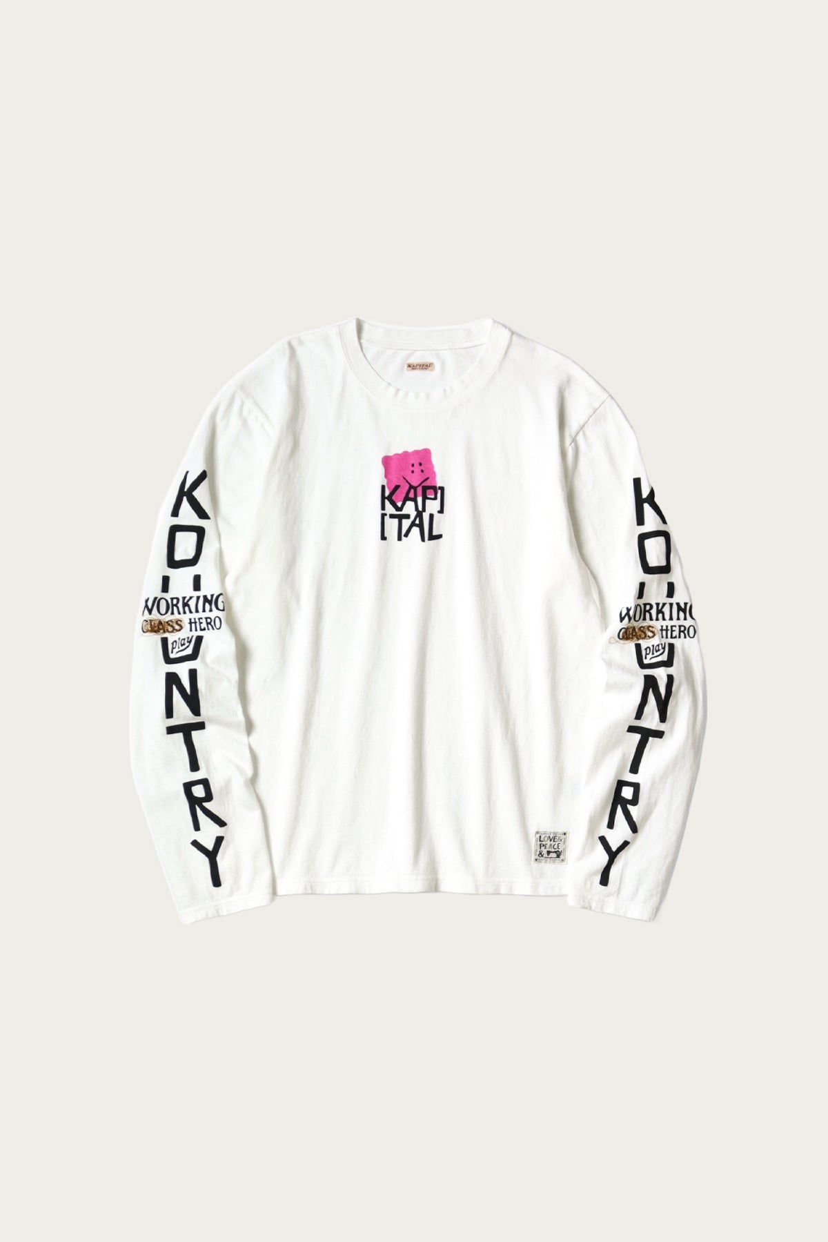Bold, offbeat, and unmistakably Kapital. The 20/-Jersey Crew Long Sleeve T (PECKISH KAP) in Pink brings together playful illustration and workwear-grade construction in a piece that feels artful and irreverent. Made from midweight cotton jersey, the tee has a soft but sturdy hand and a relaxed fit that hangs just right. Front and center is Kapital’s “PECKISH KAP” character, wide-eyed, surreal, and printed in full color with textured ink that wears beautifully over time. The pink base adds a dose of washed-out pop that plays against the graphic’s humor and strangeness, all tied together by classic crewneck structure and Kapital’s signature off-kilter charm. It’s the kind of piece you don’t just wear, you live in it. Pair with baggy denim or wide-leg fatigues to balance the proportions. Layer it under a Kapital vest or open chore coat for visual contrast, or let it stand alone with vintage-washed bottoms and canvas sneakers. Meant to be worn loud and lived-in. - 100% cotton midweight jersey - PECKISH KAP character graphic with textured print - Faded pink colorway with vintage tone - Relaxed fit with ribbed crew neck and cuffs - Made in Japan