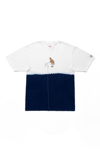 - Color: White x Indigo - Made from smooth jersey fabric. - Hand-dyed with indigo. - It features a print of fishing on frozen water. - 100% cotton - This product uses Indigo dyes. The color may transfer to other clothing when worn. - Made in Japan - Model is 6'2 wearing a size L