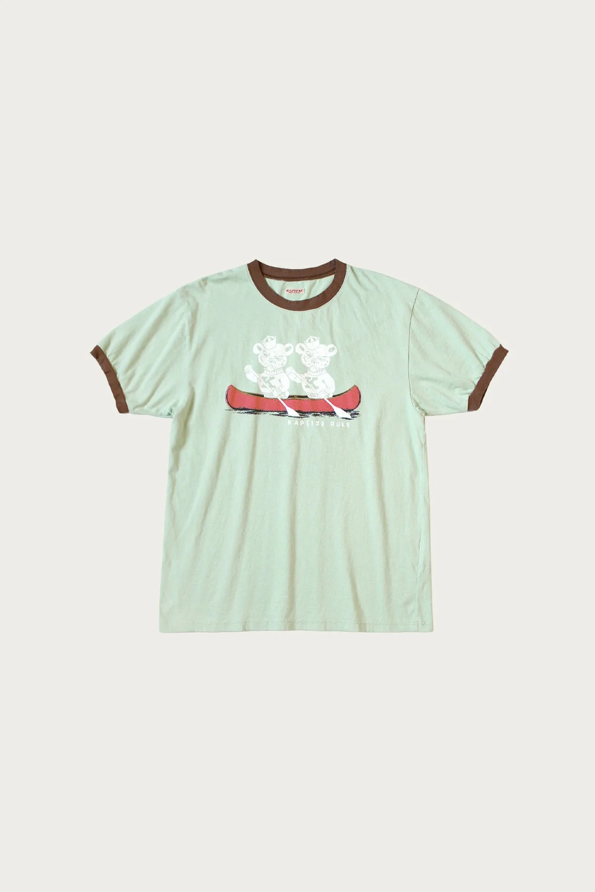 Vintage gym style ringer tee with the double paddle K Bear print. Soft washed jersey with contrast ribbing. Looks great with denim, fatigues, or under a cardigan. - 100% Cotton jersey - Ringer neckline and cuffs - Printed K Bear graphic - Relaxed fit - Mint