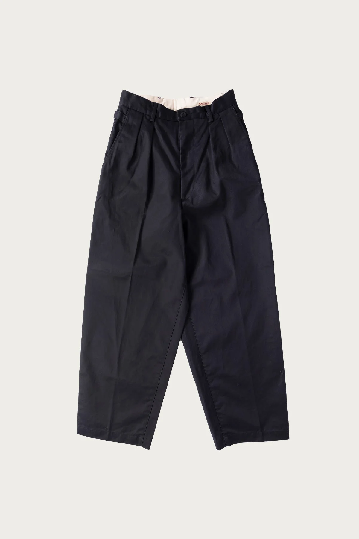 Drawing inspiration from 1940s zoot suits, these trousers feature a high-rise, wide-leg silhouette that tapers subtly at the ankle. Crafted from durable Westpoint cotton twill, they offer both structure and comfort. Available in versatile navy, beige, and natural hues. - 100% Westpoint cotton twill - High-rise, wide-leg fit - Tapered ankle - Button fly closure - Side and back pockets - Made in Japan - Navy