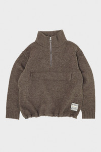 This half zip anorak is a super clean and cozy take on a classic quarter zip sweater. Cut roomy and in a shetland wool for a cozy fit and feel, this sweater is going to be perfect all winter long. The iconic stand collar, zip closure, and adjustable waist band are all awesome details that make this a great piece. Fits true to size. - 5G Shetland Wool - Half Zip - Anorak Style - Adjustable Waist Band - Non-Functional Kangaroo Pocket - Made in Japan - Brown