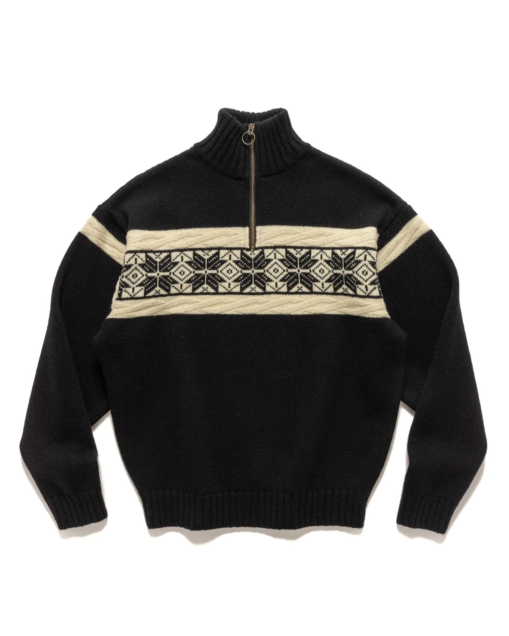 Relaxed, holiday inspired half zip pullover in a low gauge wool knit, perfect for layering with and keeping warm indoors. The cozy piece features a geometric snowflake pattern woven across the chest, and is finished with a zip up high neck collar perfect for a seasonal winter look. Made in Japan. DETAILS - K2311LC149 - 100% Wool - Relaxed fit - Woven graphic pattern - Zip up high neck collar - Ribbed collar, cuffs, and hem - Made in Japan