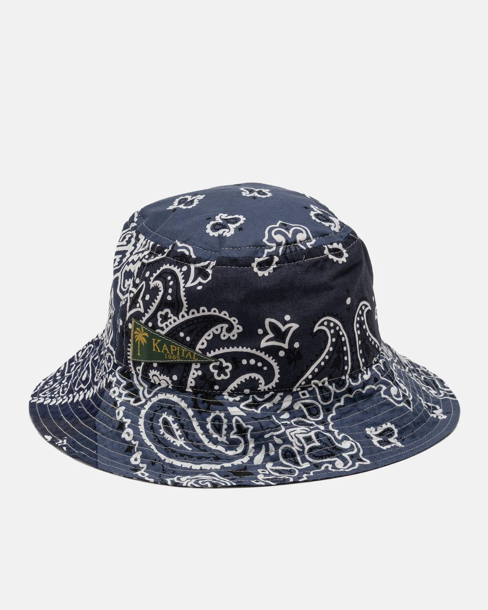 Lightweight and breathable, this bucket hat from KAPITAL is constructed from vintage-style cotton bandanas in a distinctive patchwork layout. Each panel offers a unique mix of paisley patterns, creating visual depth with a one-of-a-kind feel. The soft brim provides sun protection without structure, ideal for summer days. Finished with a woven flag label at the crown. DETAILS - EK-1233XH - 100% Cotton - Each item is unique - Woven flag label - Made in Japan