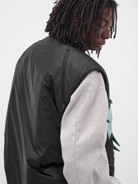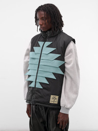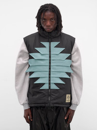 Featuring: • Relaxed fit • Padded • Synthetic leather graphic appliques at front • Stand collar • Two-way zip closure and circular zip pulls • Sleeveless and armholes • Zip vents at shoulders • Side zip pockets • Logo patch at hem • Lined • Made in Japan • Outer: 100% Nylon | Lining: 100% Polyester | Filling: 100% Polyester • Japanese sizing Model is 6’2” wearing size 3. Shoulders: 19” Chest: 38” Waist: 28”