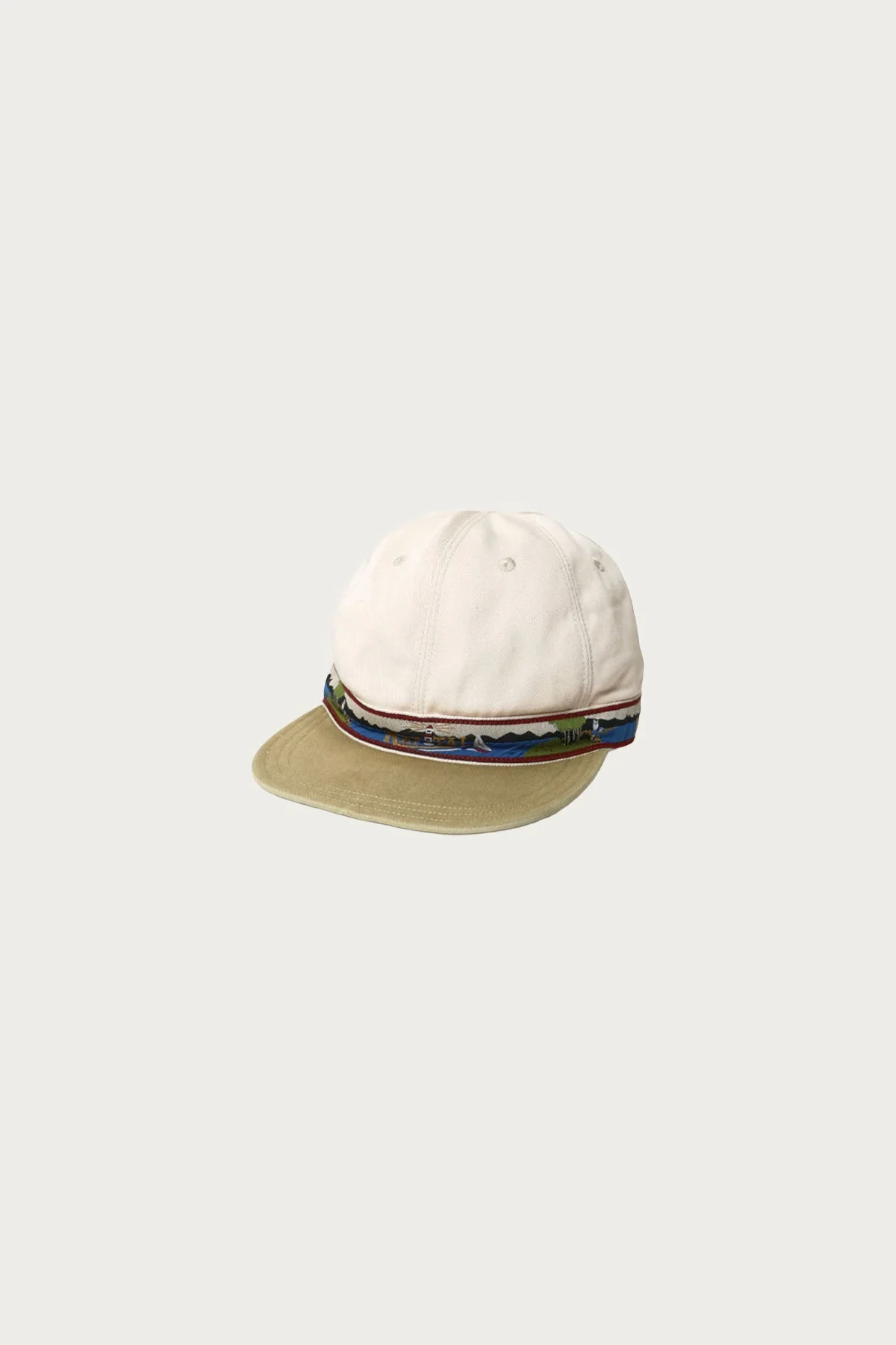 Kapital takes a classic ball cap shape and filters it through their signature playful Americana lens. With a warm beige brim and a storybook landscape band, this colorway brings a sun baked feeling to the silhouette. It reads vintage and well traveled right out of the box. The combination of earthy tones and playful details makes it one of those Kapital pieces that is charming without being loud. - Chino twill crown - Brim in washed beige - Woven landscape band - Six panel construction - Adjustable strap - Made in Japan