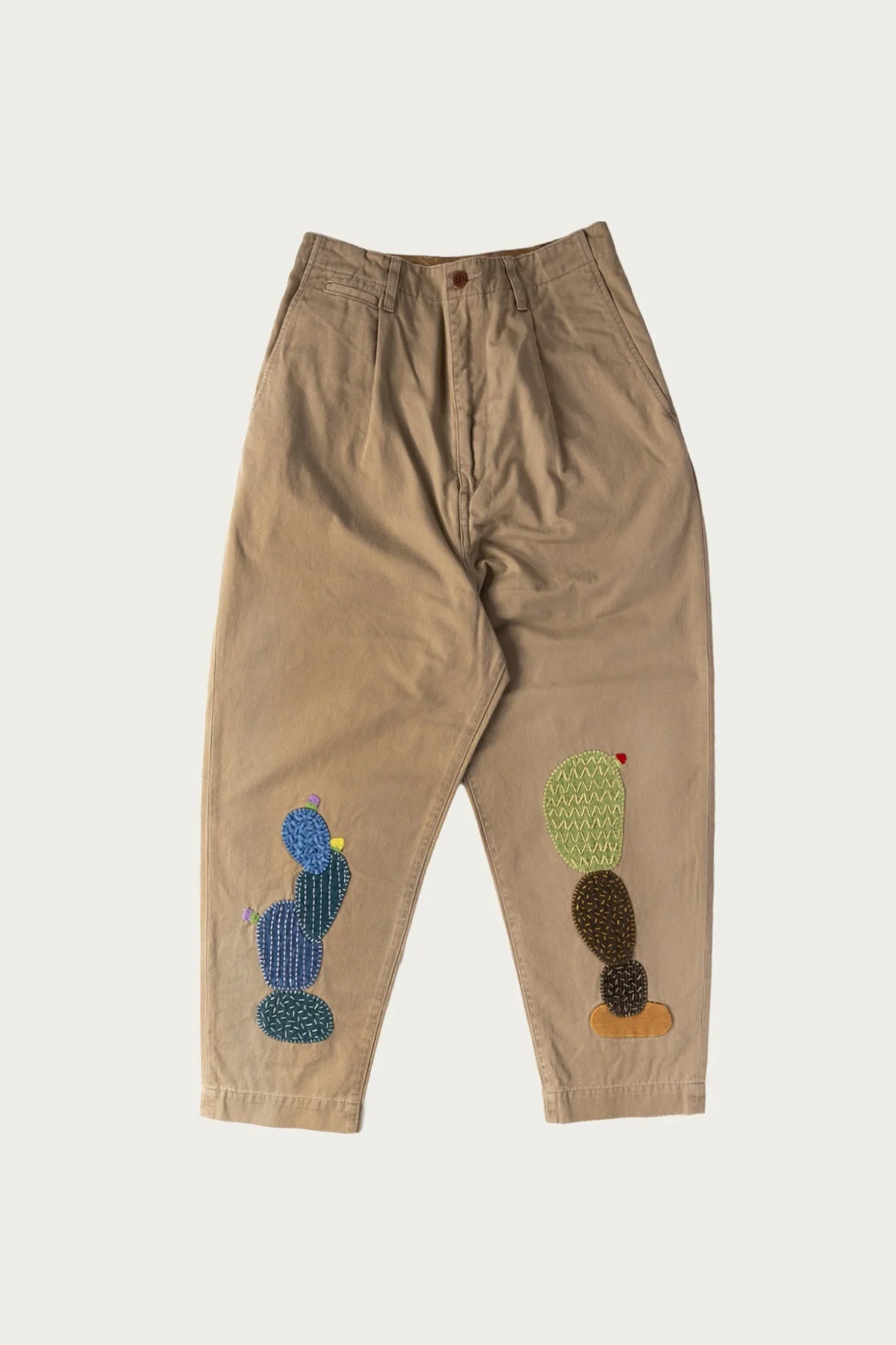 A fusion of workwear and artistry, these high-waisted NIME pants feature playful cactus embroidery near the hem. The relaxed fit and adjustable back cinch offer both comfort and a customizable silhouette. Crafted from sturdy chino cotton, they're built to last. - 100% chino cotton - High-waisted, relaxed fit - Adjustable back cinch - Cactus embroidery near hem - Button fly closure - Made in Japan - Beige