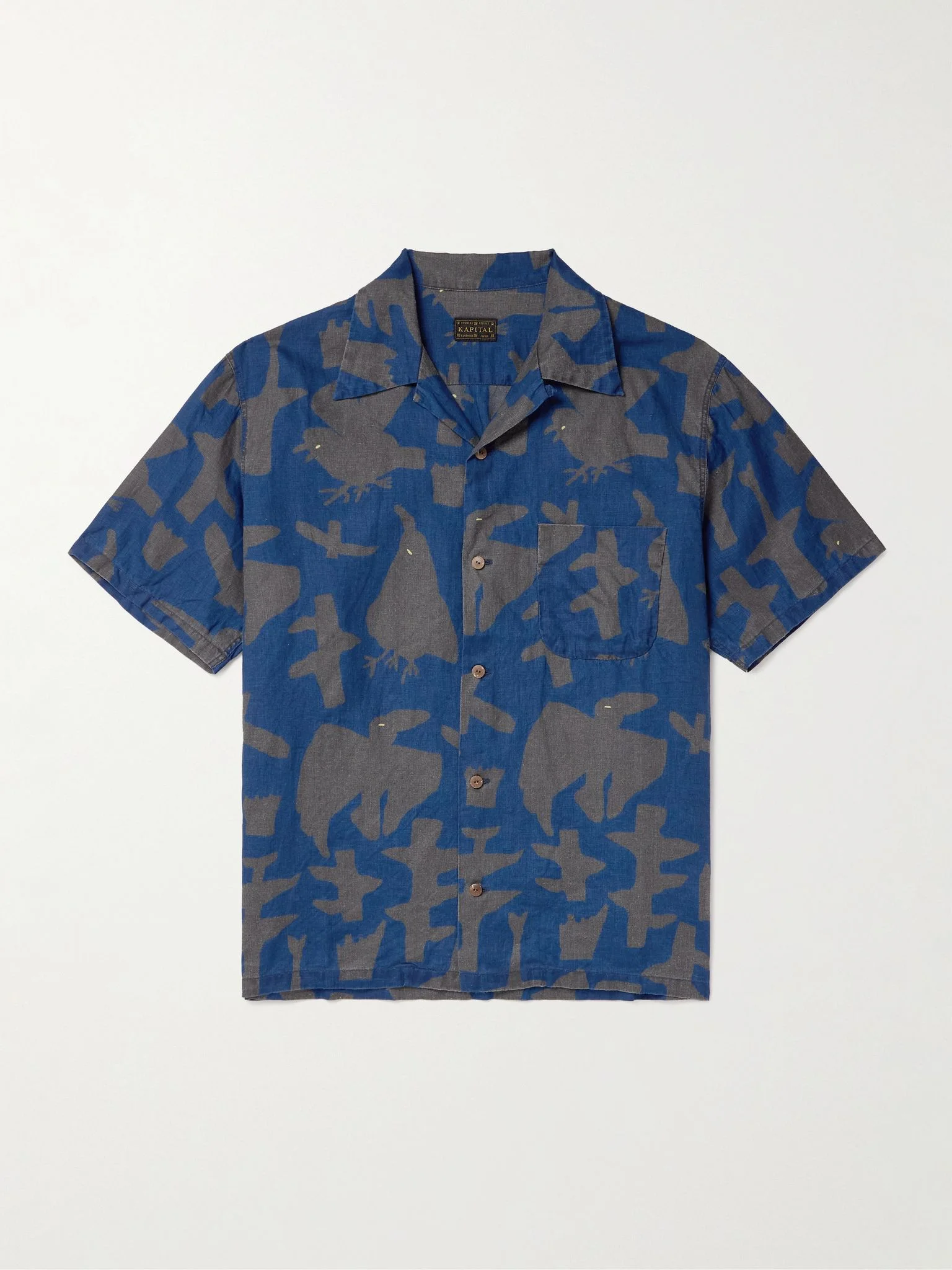 KAPITAL's convertible-collar shirt is inspired by the 'Aloha' styles of the '20s and '30s. It's been made in Japan from indigo-dyed linen and is patterned with a block print including trees and ravens. Lean into its vintage look and wear it with pleated shorts. Size & Fit - Size 1 = XS, 2 = S, 3 = M, 4 = L, 5 = XL and 6 = XXL - Fits true to size. Take your normal size - Designed for a relaxed fit - Lightweight, non-stretchy fabric - Model is shown wearing a 3 - Model measures: chest 38"/ 96cm, height 6'3"/ 191cm Details & Care - Blue and grey linen - Button fastenings - 100% linen - Unlined - Hand wash