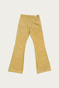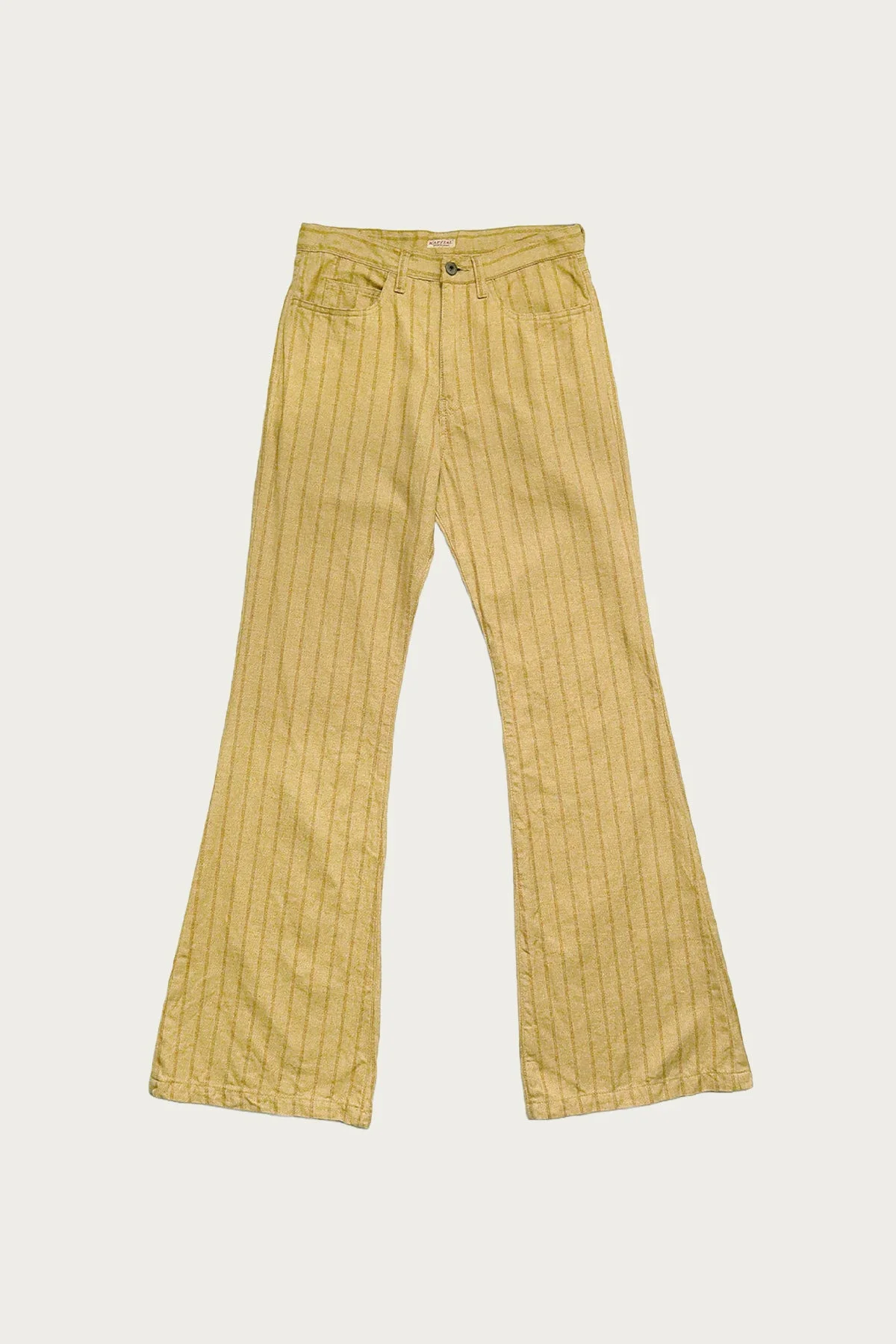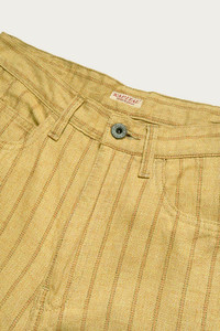 Woven with a slubby texture and subtle vertical stripe, these trousers blur the line between vintage utility and artful tailoring. They have a flared silhouette and classic five-pocket setup. The linen blend keeps them breezy enough for warm weather, and the tonal vertical stripes elongate the silhouette. Try with a tucked tee or cropped jacket. - Cotton-linen blend with soft drape - Vertical GIBSON stripe fabric - 5-pocket construction with button fly - Slightly tapered silhouette - Made in Japan - Gold
