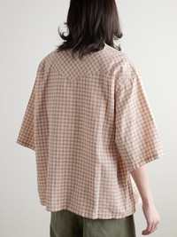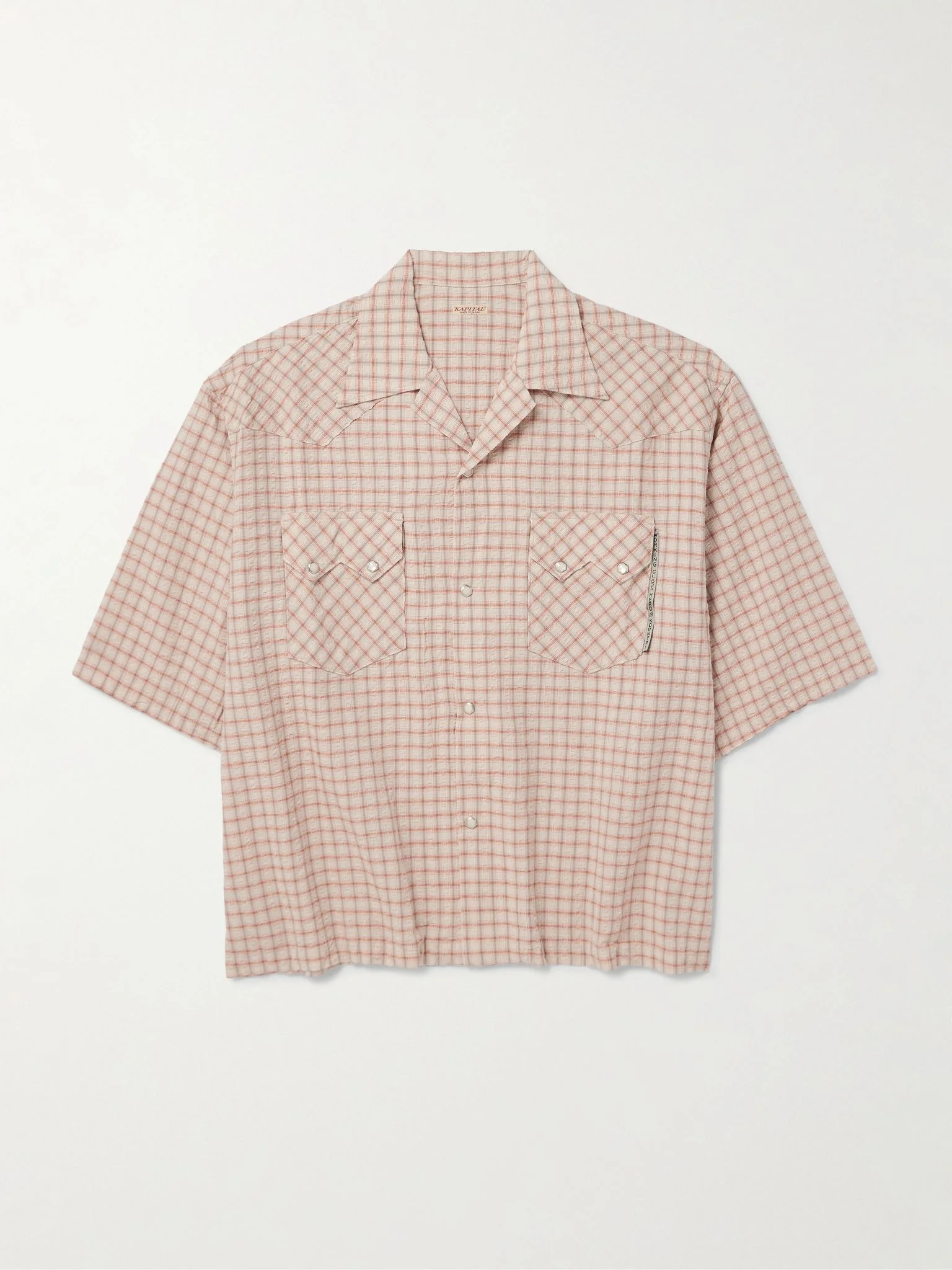 KAPITAL's camp-collar shirt references classic Western style with a pointed yoke and pearlescent snap fastenings. Cut for a boxy fit, it's been made in Japan from checked cotton and linen-blend seersucker and features a 'Working Class Hero' applique, designating the 'Kountry' line, along the chest flap pocket. Size & Fit - Size 1 = XS, 2 = S, 3 = M, 4 = L, 5 = XL and 6 = XXL - Model wears a size larger to achieve a looser fit - Lightweight, non-stretchy fabric - Model is shown wearing a 3 - Model measures: chest 38"/ 96cm, height 6'1"/ 185cm Details & Care - Beige, orange and mushroom cotton and linen-blend seersucker - Snap fastenings - 80% cotton, 20% linen