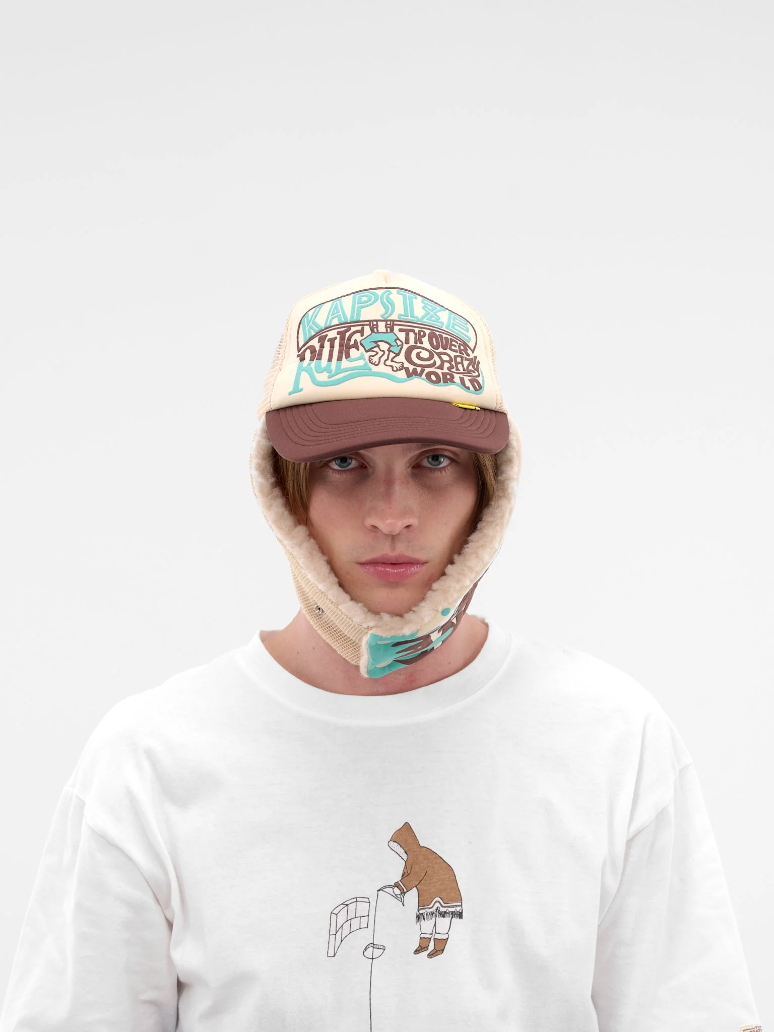 Ecru and brown trucker and aviator hat hybrid in poly and mesh with six panel design, graphic print, and shearling lining. Featuring: • Adjustable fit • Trucker and aviator hat hybrid design • Six panel hat • Graphic print at face and ear flaps • Contrast curved brim • Logo tag and tonal topstitching at brim • Mesh paneling at back • Adjustable closure at back • Ear flaps at side • Shearling lining • Made in China • 91% Polyester 9% Polyurethane | Mesh: 100% Polyester | Boa Fleece: 100% Polyester | Sweatband Tape: 80% Cotton 20% Polyester • One size