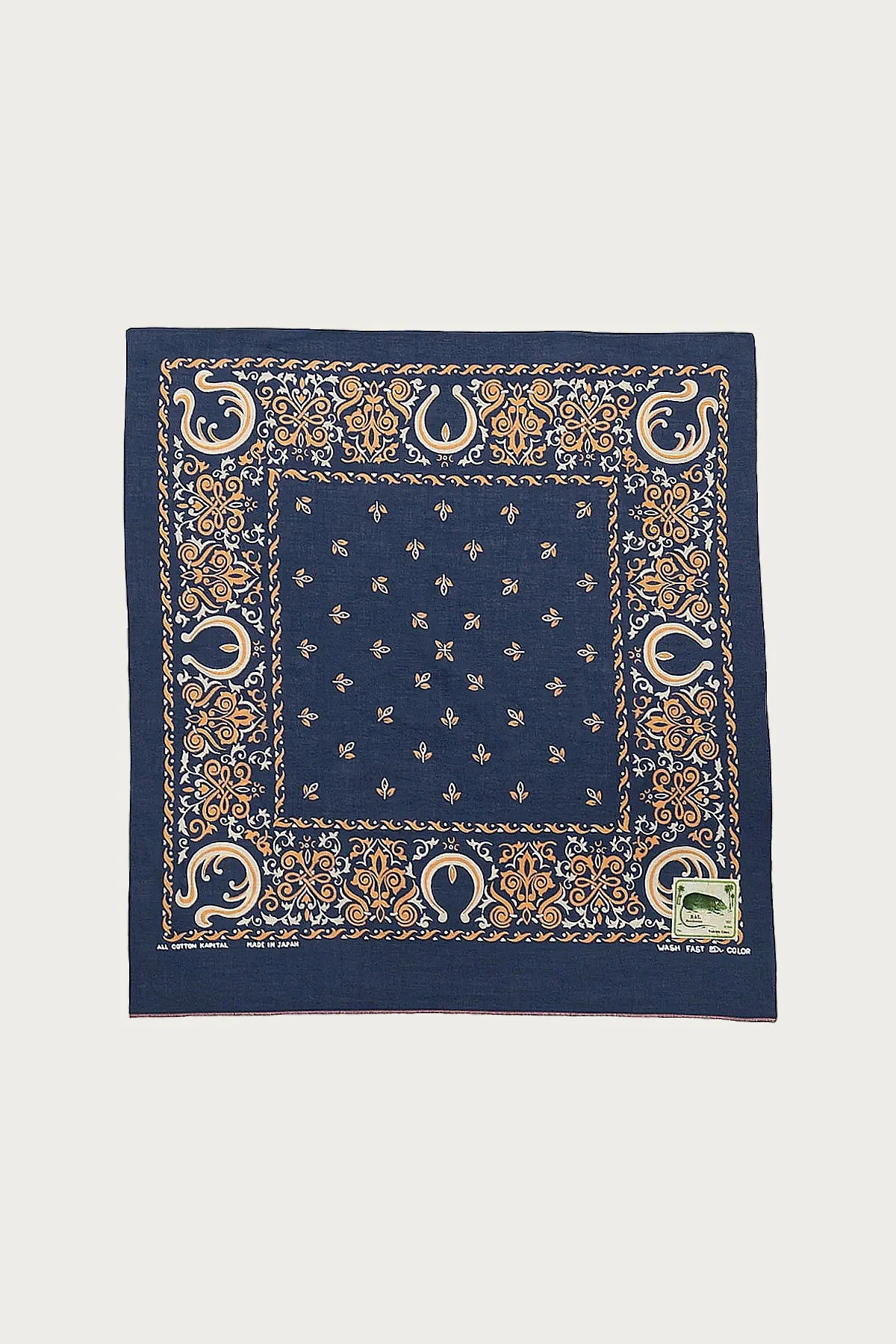 Kapital’s Fastcolor Bandanas are a staple for a reason. Made in Japan with a selvedge finish and printed using old school discharge techniques, each one softens beautifully and holds its color through years of wear. This version features the Antler Naja pattern, a mix of swirling motifs and traditional paisley elements that feel both classic and unmistakably Kapital. - 20" x 20" (slightly larger than a traditional Kapital Bandana) - 100% cotton - Fastcolor discharge print - Selvedge edges - Made in Japan - Navy