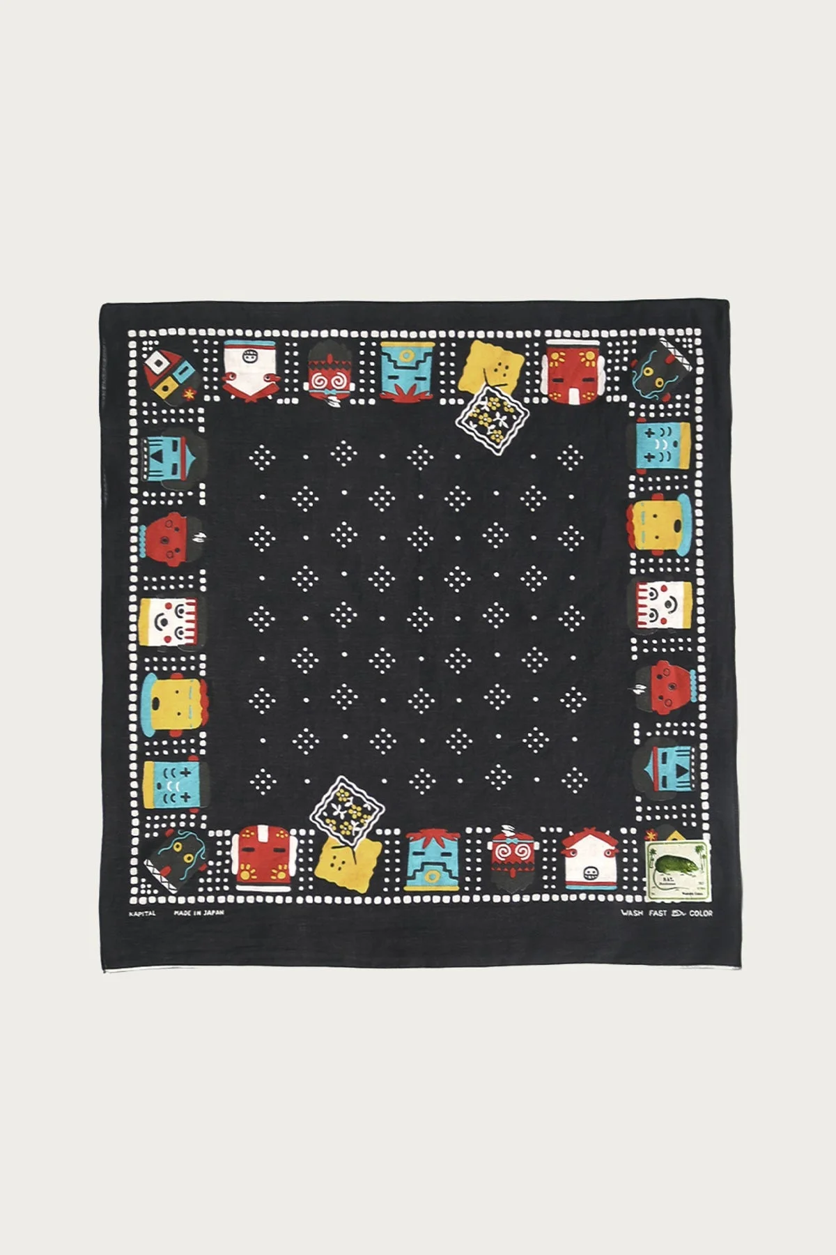 Each bandana features a border of stylized Kachina figures rendered in Kapital's signature playful aesthetic. The central field showcases a traditional dotted pattern, adding depth and balance to the design. Crafted from 100% cotton, these bandanas are produced using traditional discharge dyeing techniques, ensuring the colors remain vivid and the fabric softens beautifully over time. The selvedge edges provide durability and a touch of refinement, making each piece both functional and collectible. - 100% cotton - Discharge dyed for lasting color - Made in Japan - Dimensions: Approximately 52cm x 52cm - Black
