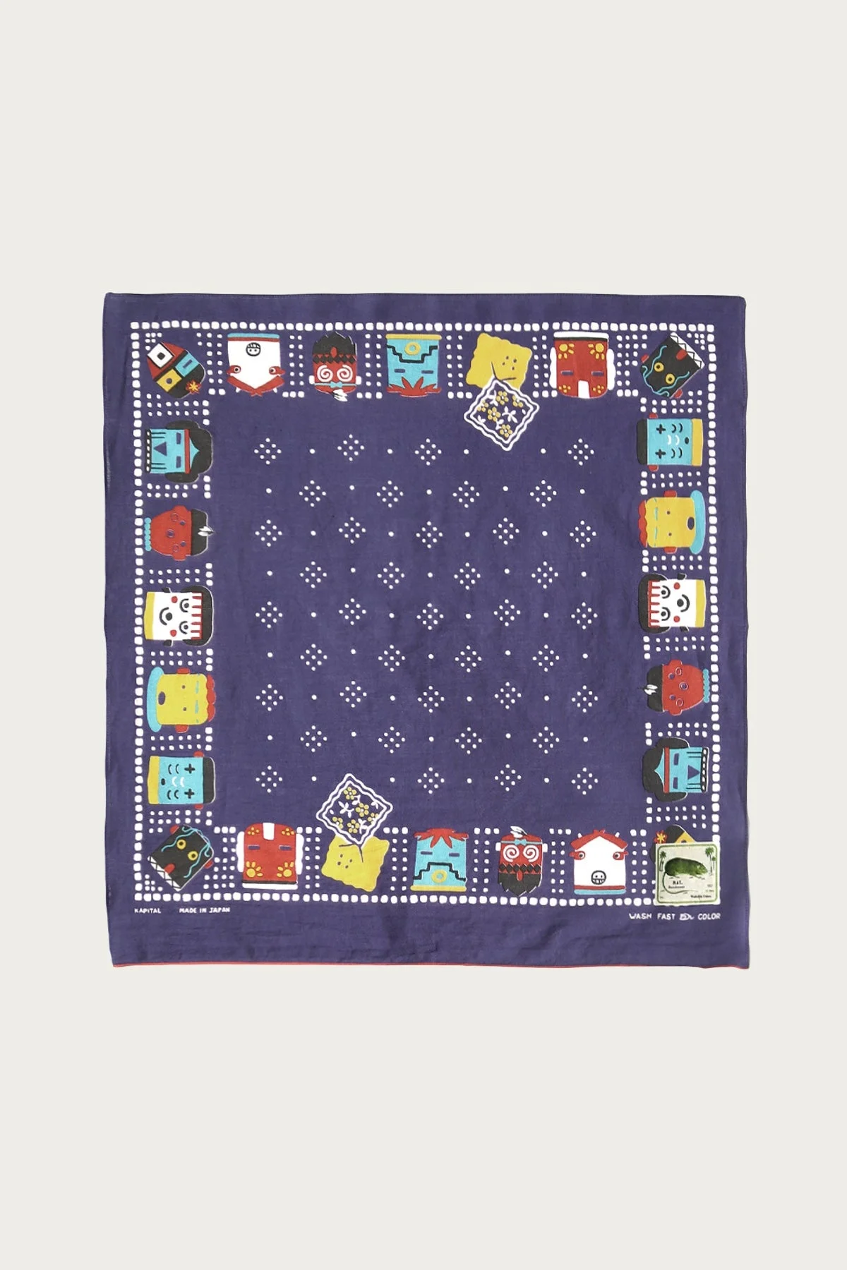 Each bandana features a border of stylized Kachina figures rendered in Kapital's signature playful aesthetic. The central field showcases a traditional dotted pattern, adding depth and balance to the design. Crafted from 100% cotton, these bandanas are produced using traditional discharge dyeing techniques, ensuring the colors remain vivid and the fabric softens beautifully over time. The selvedge edges provide durability and a touch of refinement, making each piece both functional and collectible. - 100% cotton - Discharge dyed for lasting color - Made in Japan - Dimensions: Approximately 52cm x 52cm - Purple
