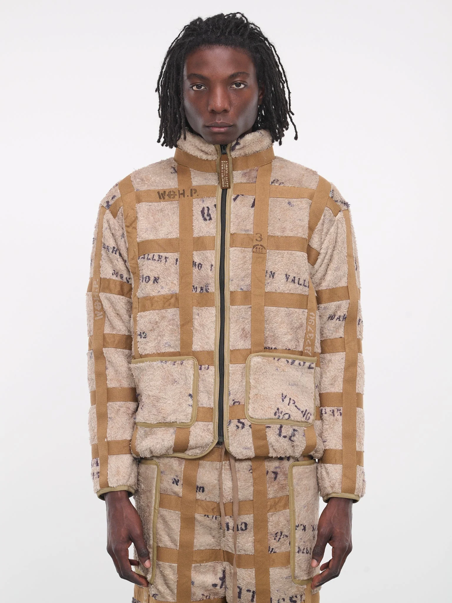 KAPITAL jacket in beige, paneled fleece construction, 'prisoner' stencil print, tape grid pattern, high neck, front exposed zip closure, branded zip pull, dropped shoulders, long sleeves, patch pockets, straight hem, regular fit. Made in Japan Outer: 100% Polyester Trim: 100% Acrylic Japanese Sizing Model is 6’2” wearing size 2. Shoulders: 19” Chest: 38” Waist: 28”