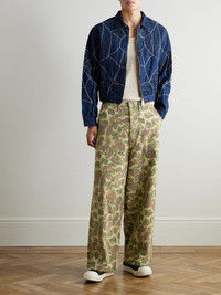 Wide-Leg Camouflage-Print Herringbone Cotton Trousers Green