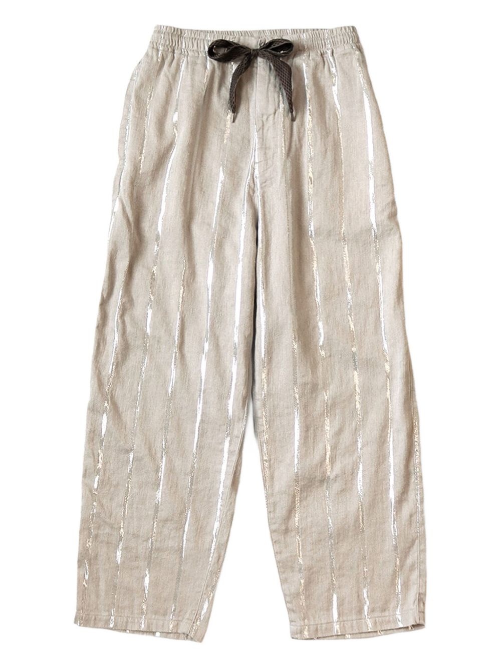 striped drawstring trousers Highlights - Ecru - Elasticated waistband - Drawstring tie fastening - Rear pocket - Vertical stripe pattern Imported Composition Linen/Flax 46%, Cotton 38%, Polyester 16%