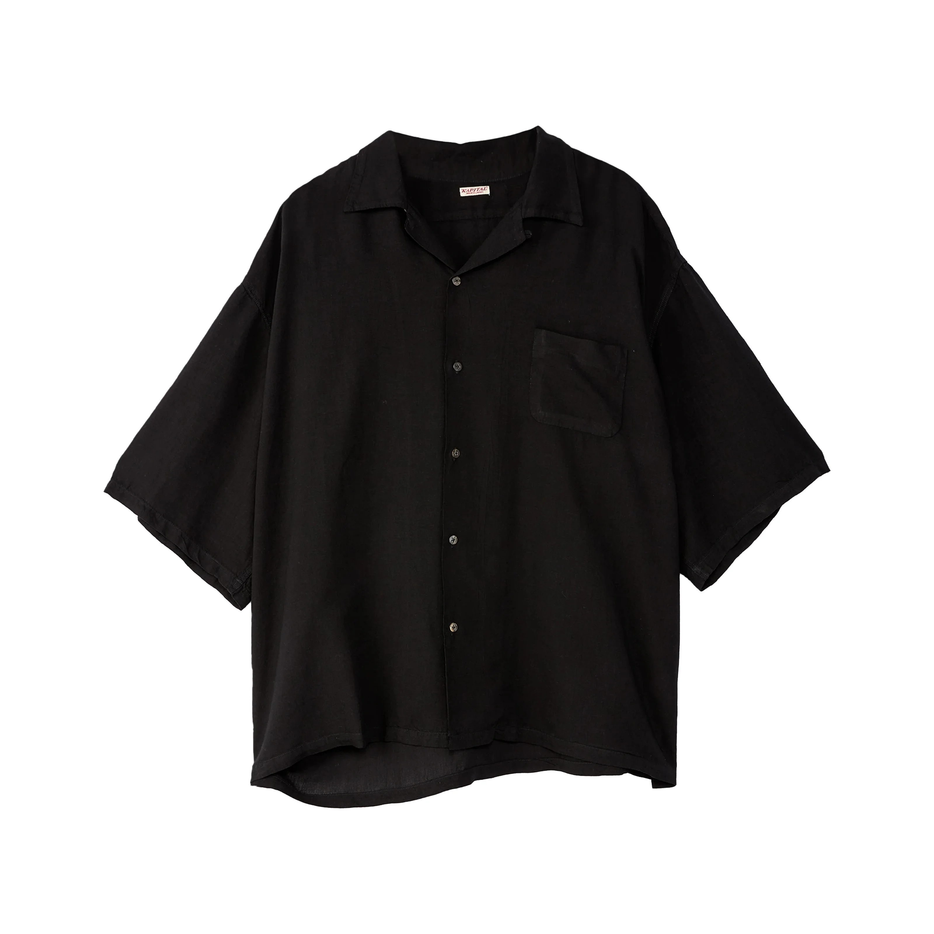 KAPITAL ITEM INFO: 70% Lyocell & 30% Linen Button closure, front pocket, camp collar, drop shoulder sleeves Size & Fit Oversized Mad in Japan SKU : EK-1433SS EK 1433SS BLAC